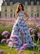 Step into a fairytale with this breathtaking floral print prom dress that captures the essence of romance and elegance. Featuring a stunning blue and white floral pattern, this ball gown is designed to make you feel like royalty at your special event.