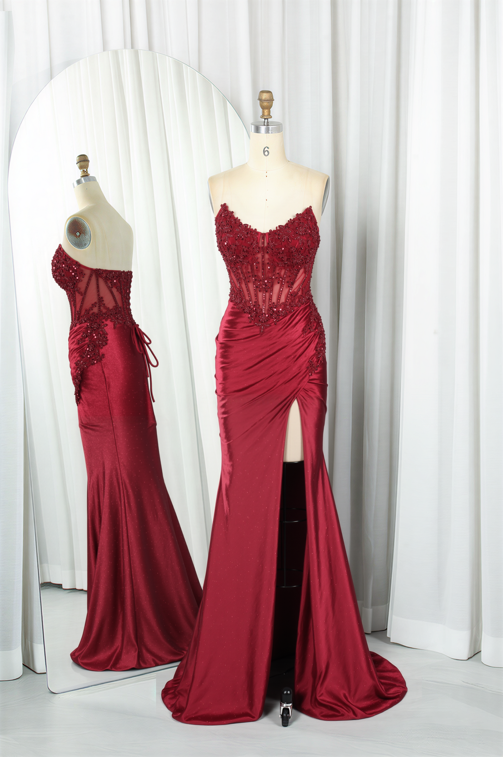 This prom dress features a sweetheart neckline with lace detailing on the bodice and a draped satin skirt. A side slit adds subtle allure and movement. Perfect for prom nights, gala events, or formal school celebrations, this dress combines classic elegance with a flattering, sophisticated silhouette.