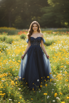 Floral Lace Appliques Tulle Off-the-Shoulder A-Line Prom Dress TFB 8001 | blissfulprom