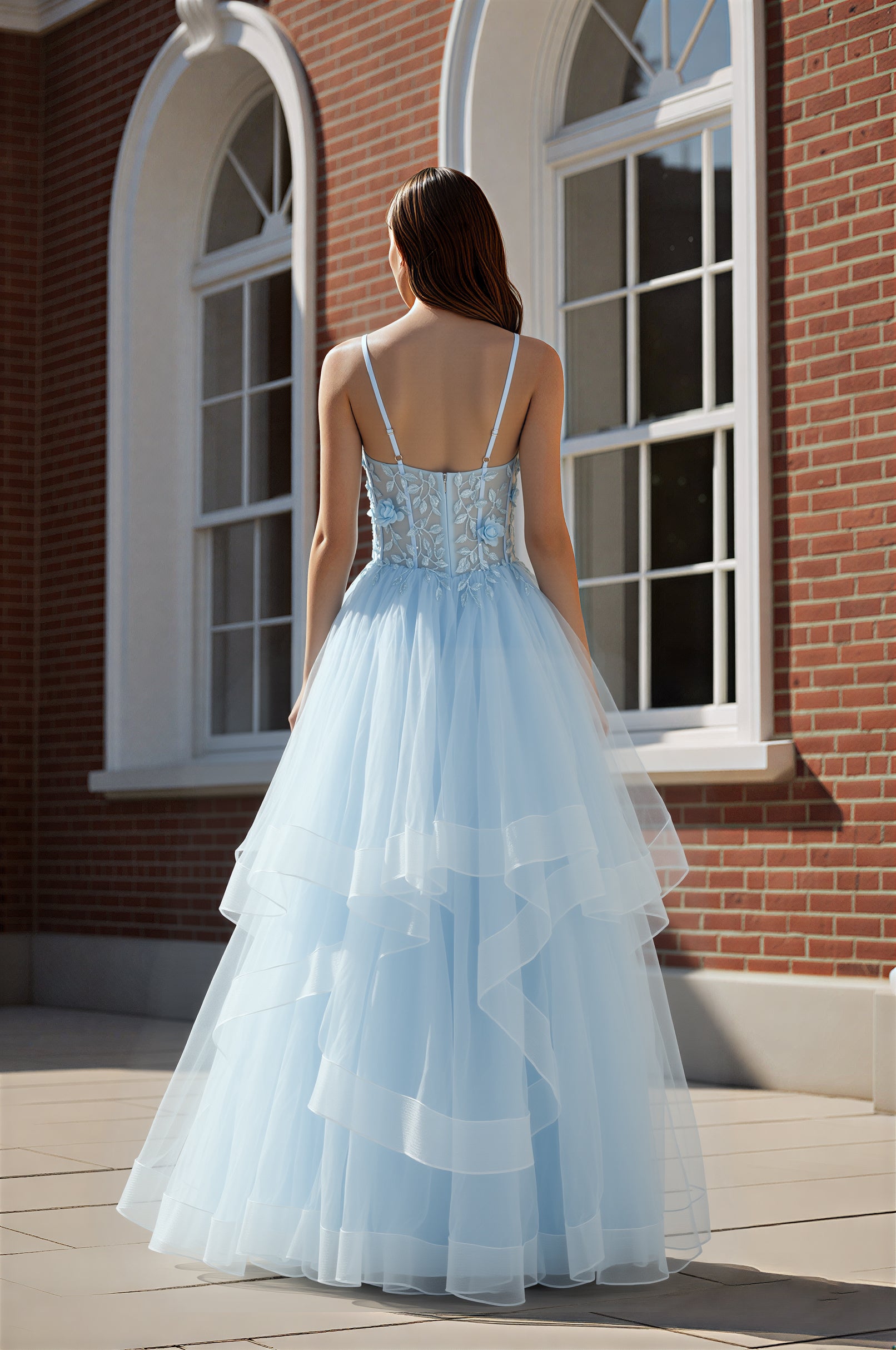 With delicate spaghetti straps, this prom dress features floral embellishments on the bodice and tiered tulle skirts that move beautifully as you walk or dance. Ideal for prom nights, photos, or formal events, the romantic design ensures a dreamy and elegant appearance.