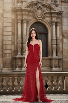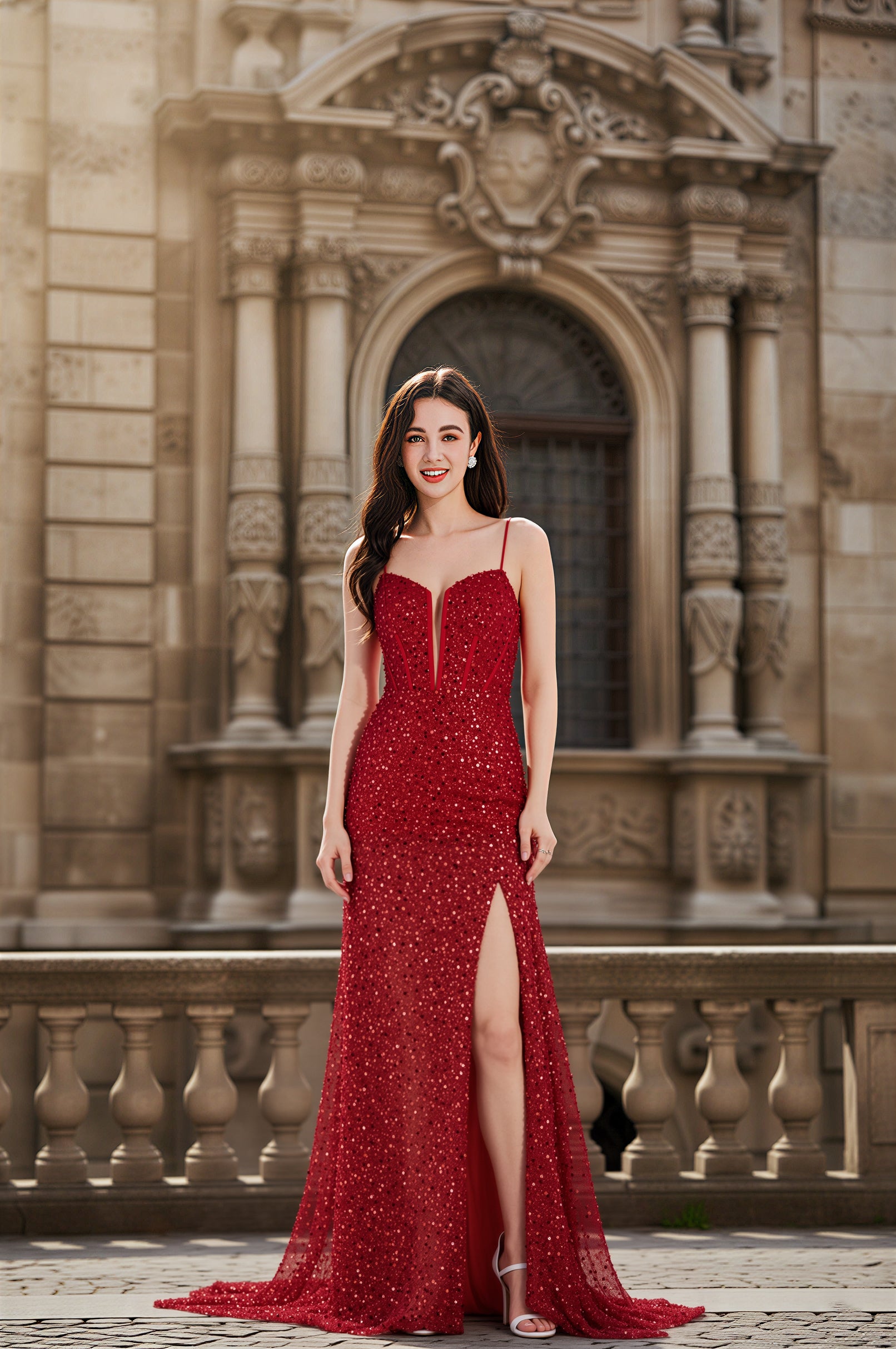 Elevate your evening look with this stunning mermaid dress, shimmering with all-over sequins for a radiant glow. The slender spaghetti straps and plunging neckline create a delicate yet bold silhouette. A lace-up back allows you to customize the fit perfectly, while the thigh-high side slit adds an unexpected hint of allure. Whether it’s prom night or a formal gala, this dress ensures you’ll captivate every room you enter.
