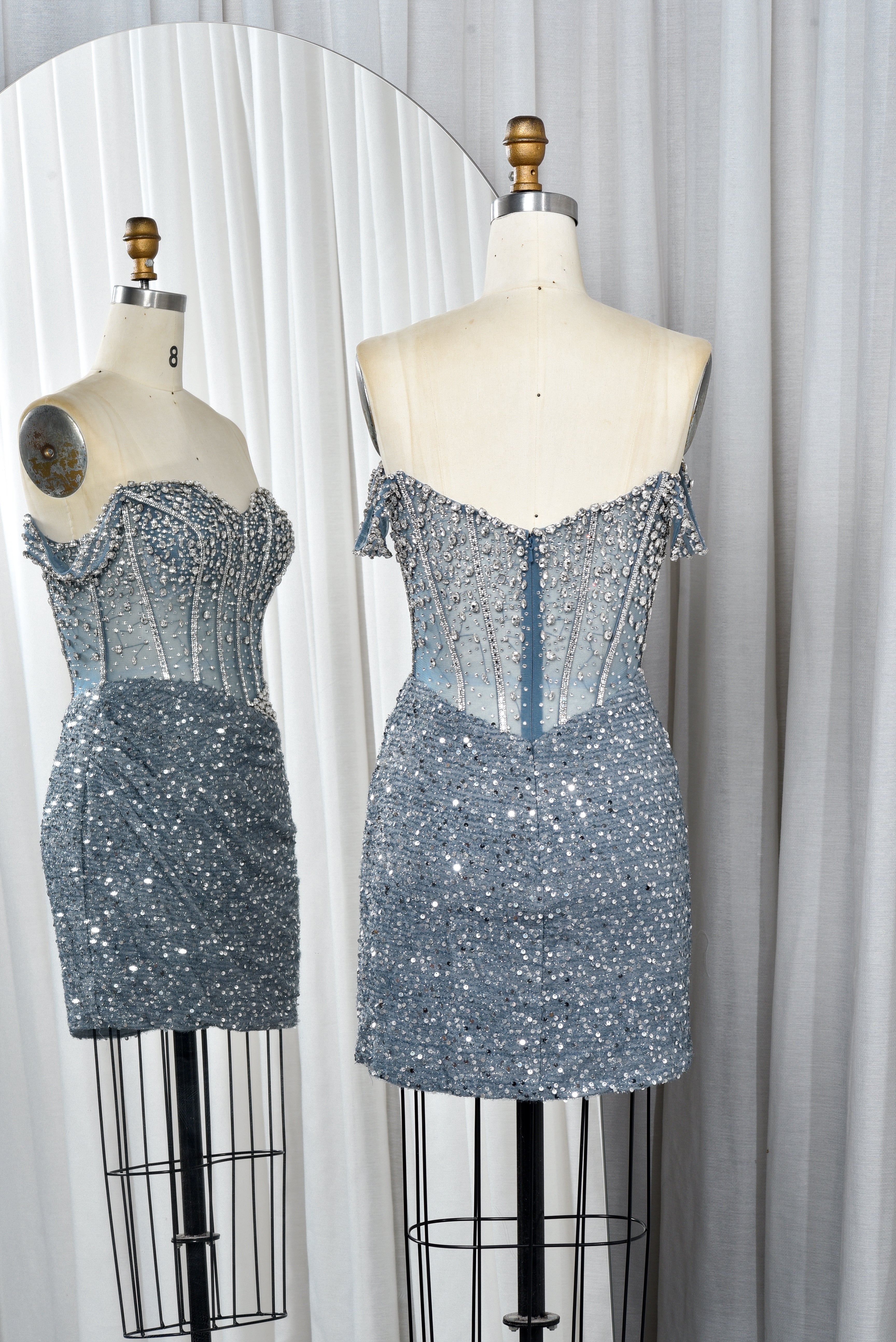 This homecoming dress features a sweetheart neckline that highlights the collarbone and shoulders. The bodice and skirt are richly decorated with delicate beadwork and shimmering sequins, creating a sparkling effect that catches the light beautifully at every angle. The skirt includes soft draping that adds graceful movement, making it both elegant and flattering. This dress is designed to stand out, offering a glamorous yet youthful look that is perfect for homecoming celebrations, parties, or other special events.