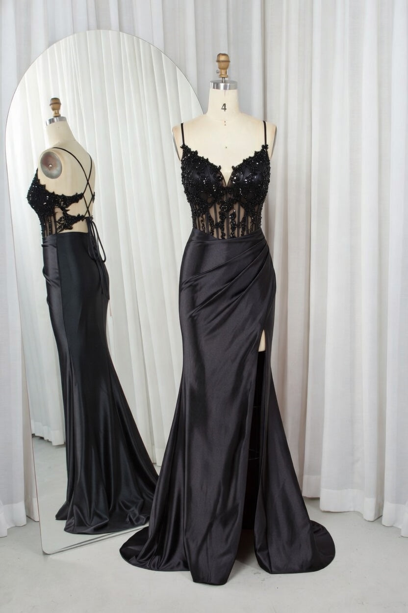 Sheer Lace Corset Satin Mermaid Prom Dress with High Slit - TFB 8011 | blissfulprom