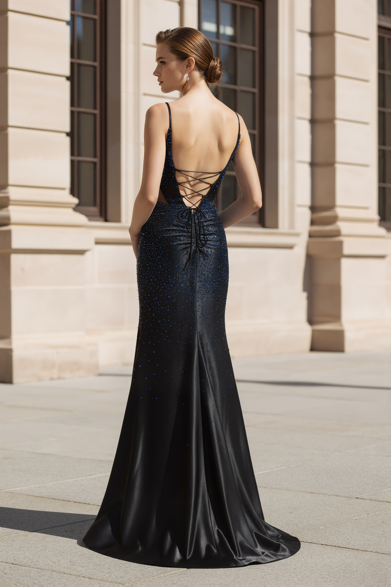 Step into the spotlight wearing this glitter-covered mermaid dress designed with thin spaghetti straps for a delicate look. The fitted silhouette gracefully follows your curves, enhanced by tasteful mesh insets that add depth and intrigue. The lace-up back offers a personalized fit, ensuring comfort throughout your special night. Perfect for prom, galas, or any formal occasion where you want to captivate attention effortlessly.