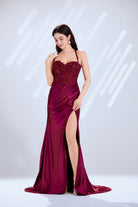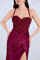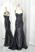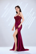 Beaded Lace Satin Prom Dress with Spaghetti Straps, Side Slit & Train – TFB6022
