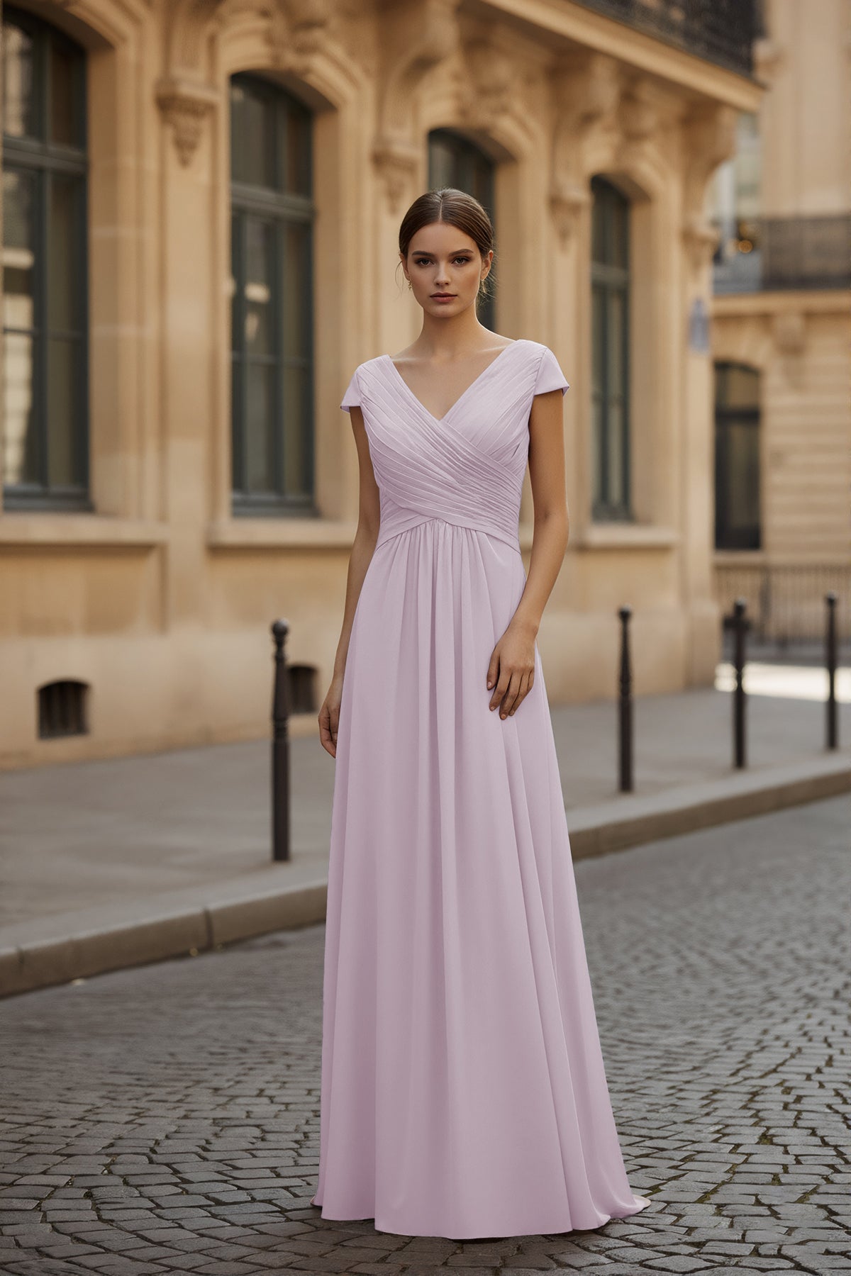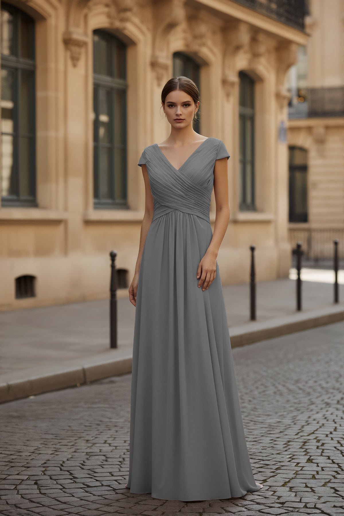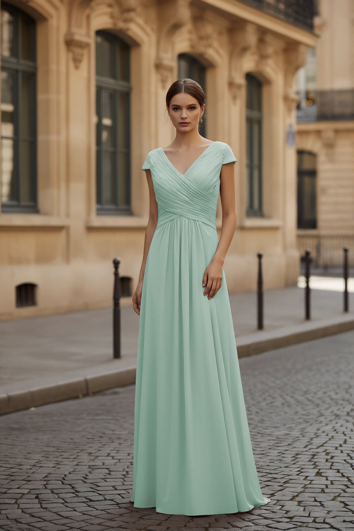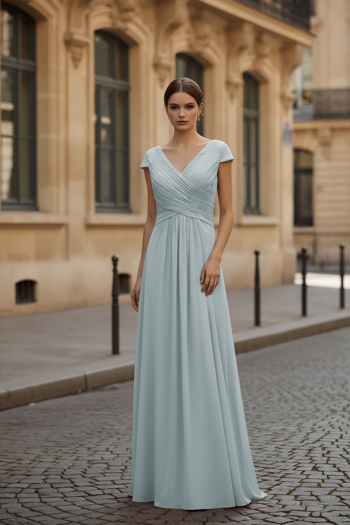 Cap Sleeve V Neck Chiffon A-Line Prom Dress with Ruched Bodice-TFB8029