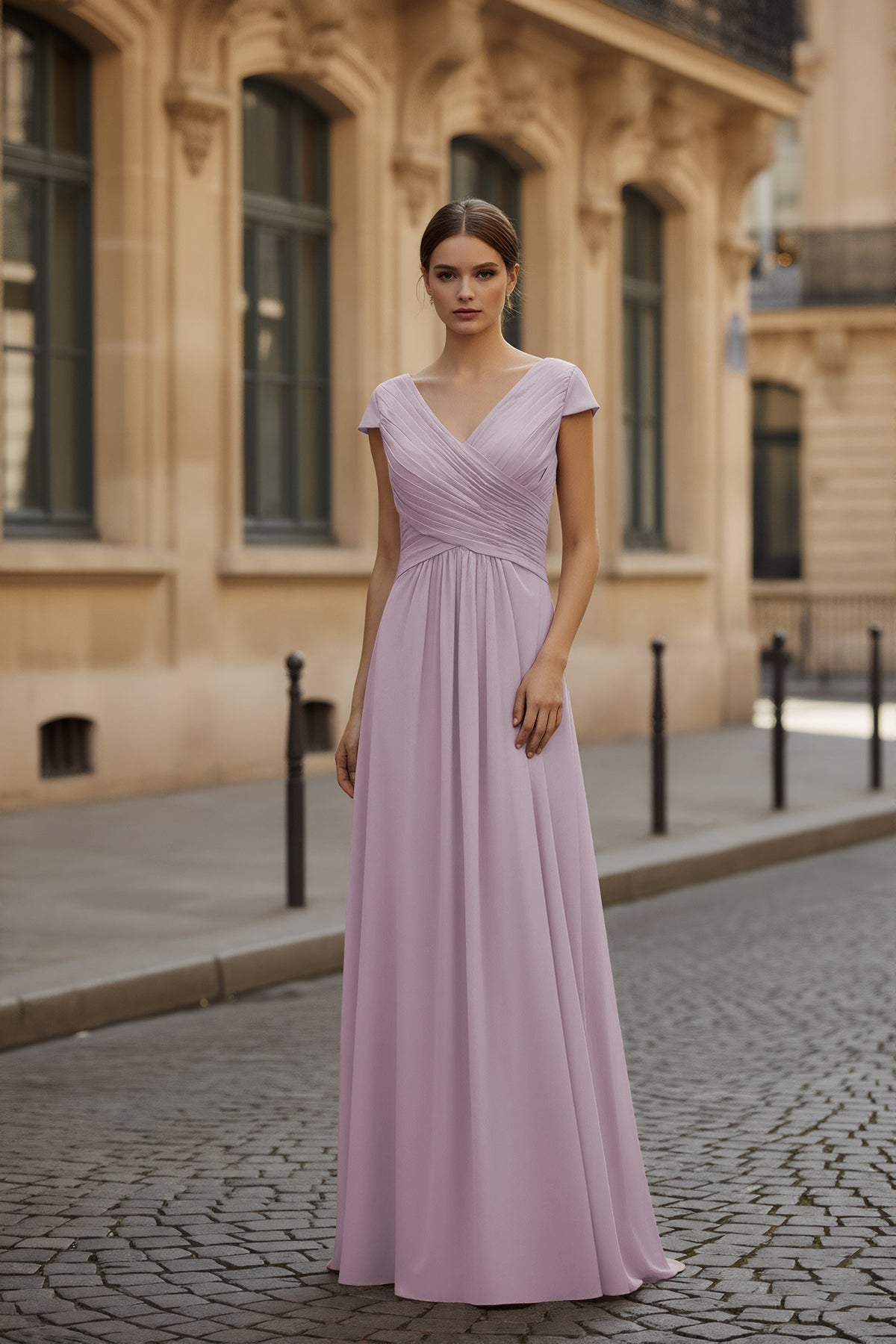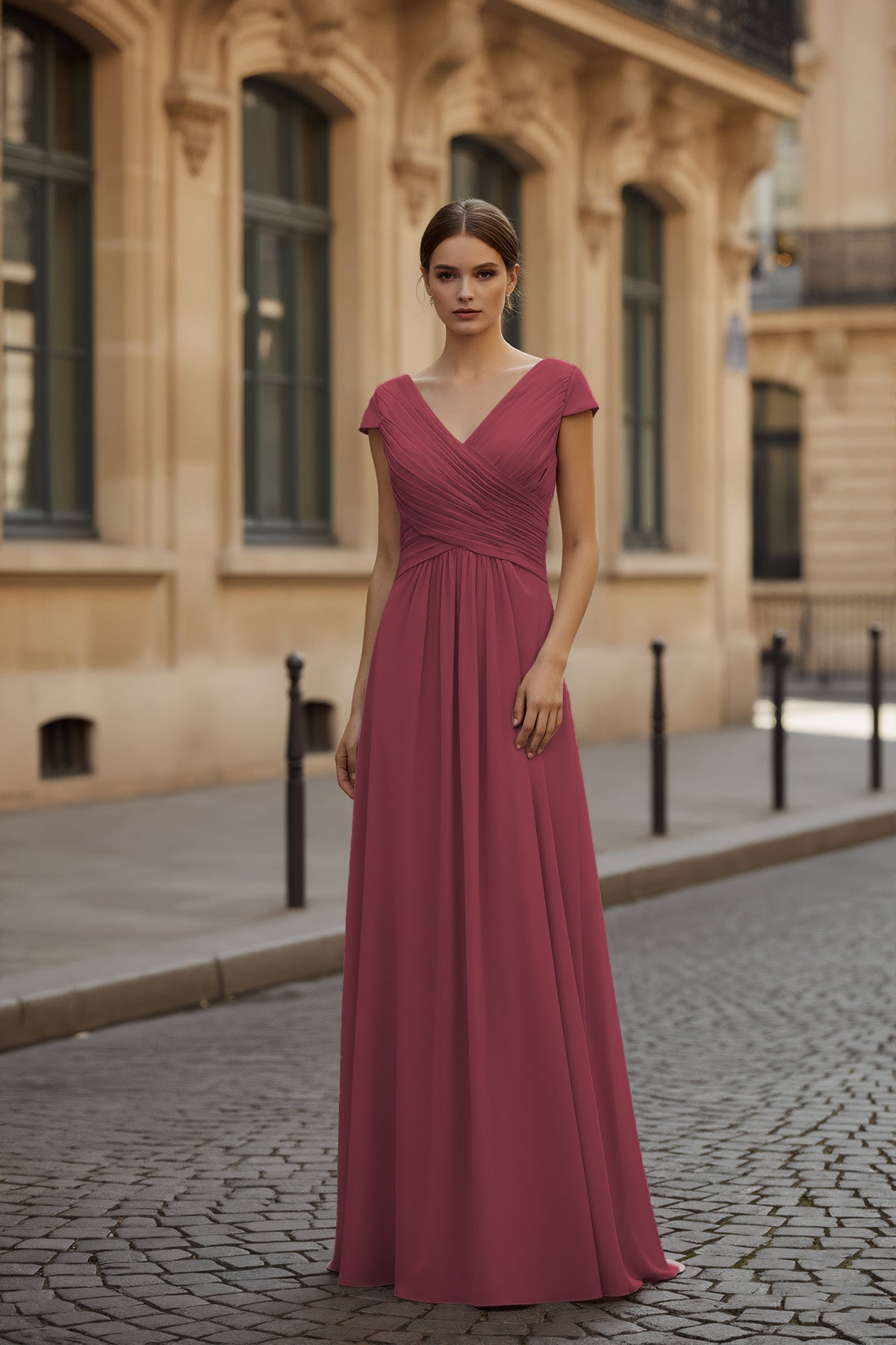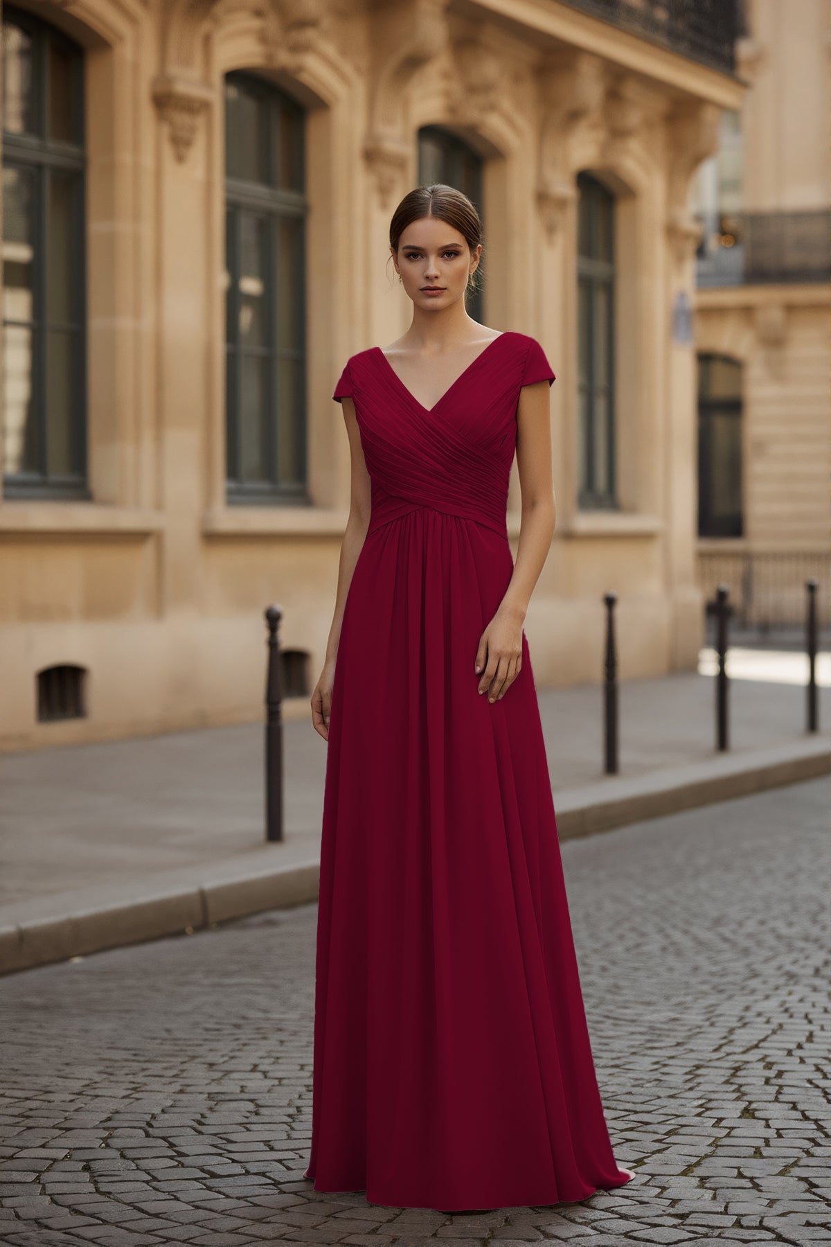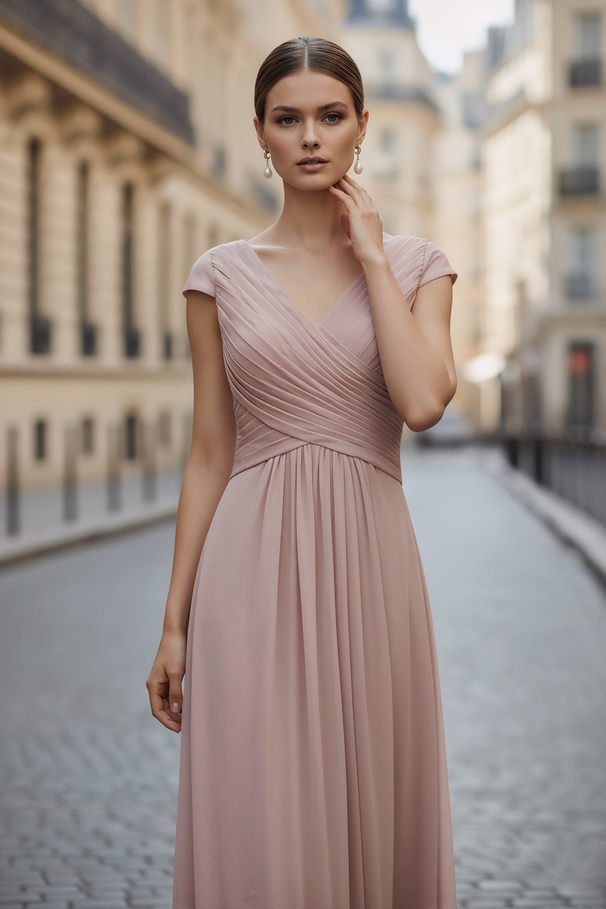 Cap Sleeve V Neck Chiffon A-Line Prom Dress with Ruched Bodice-TFB8029