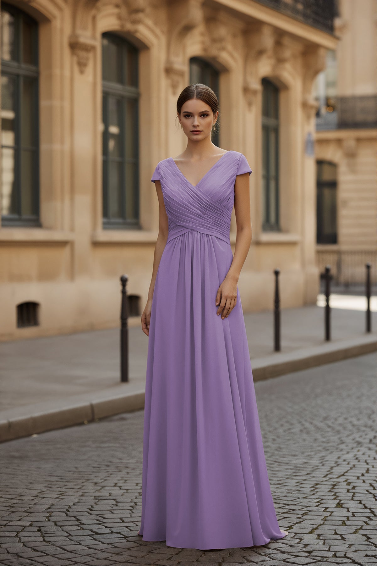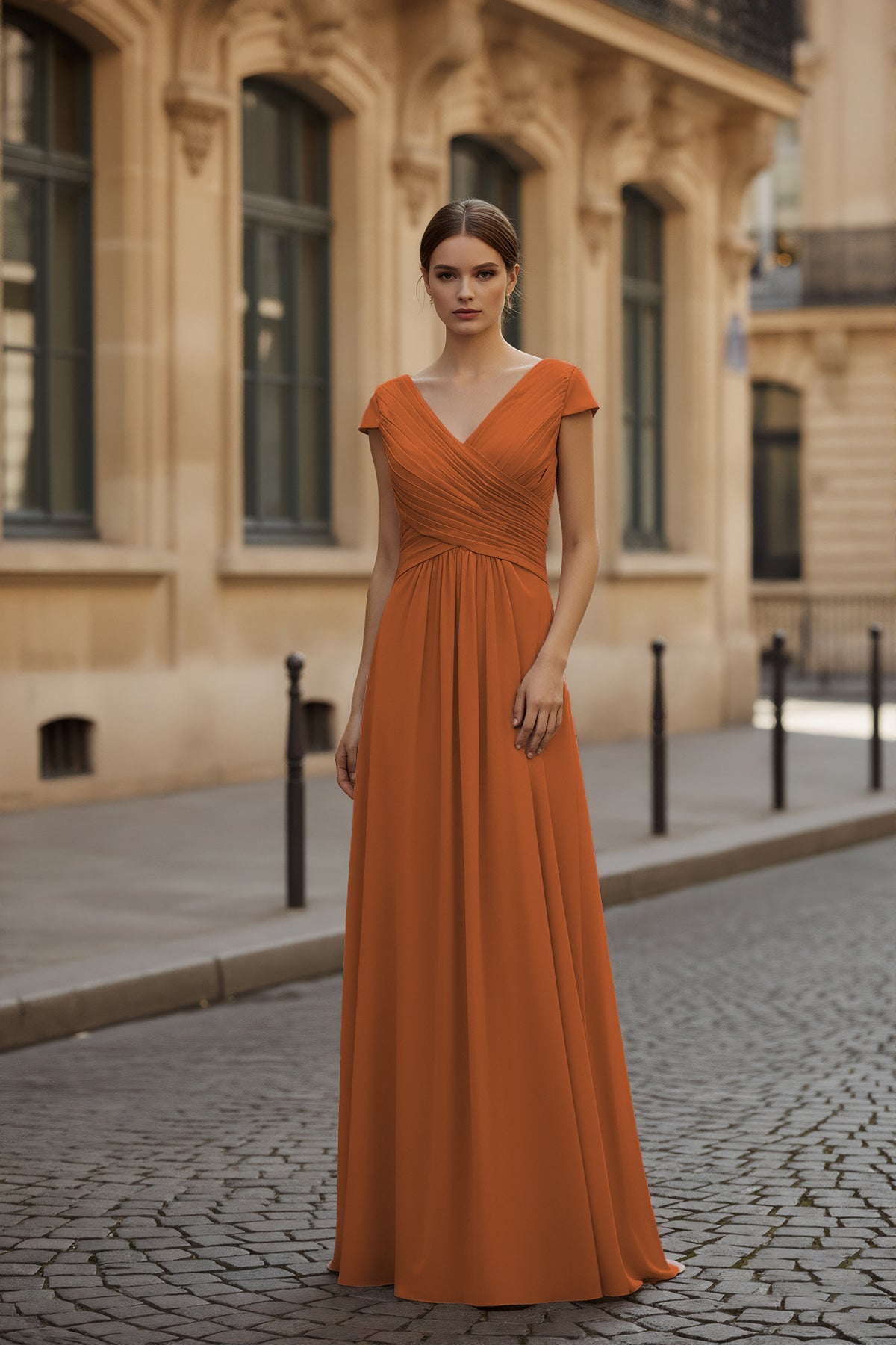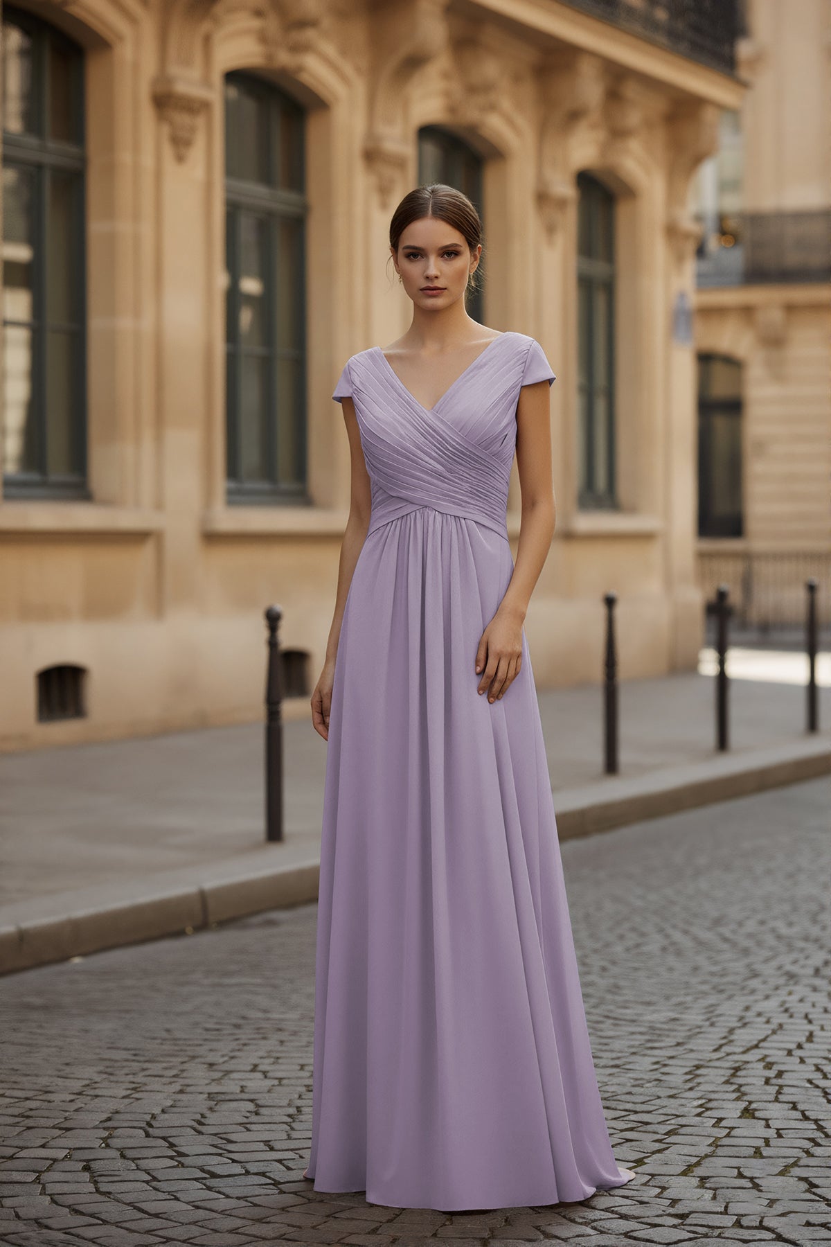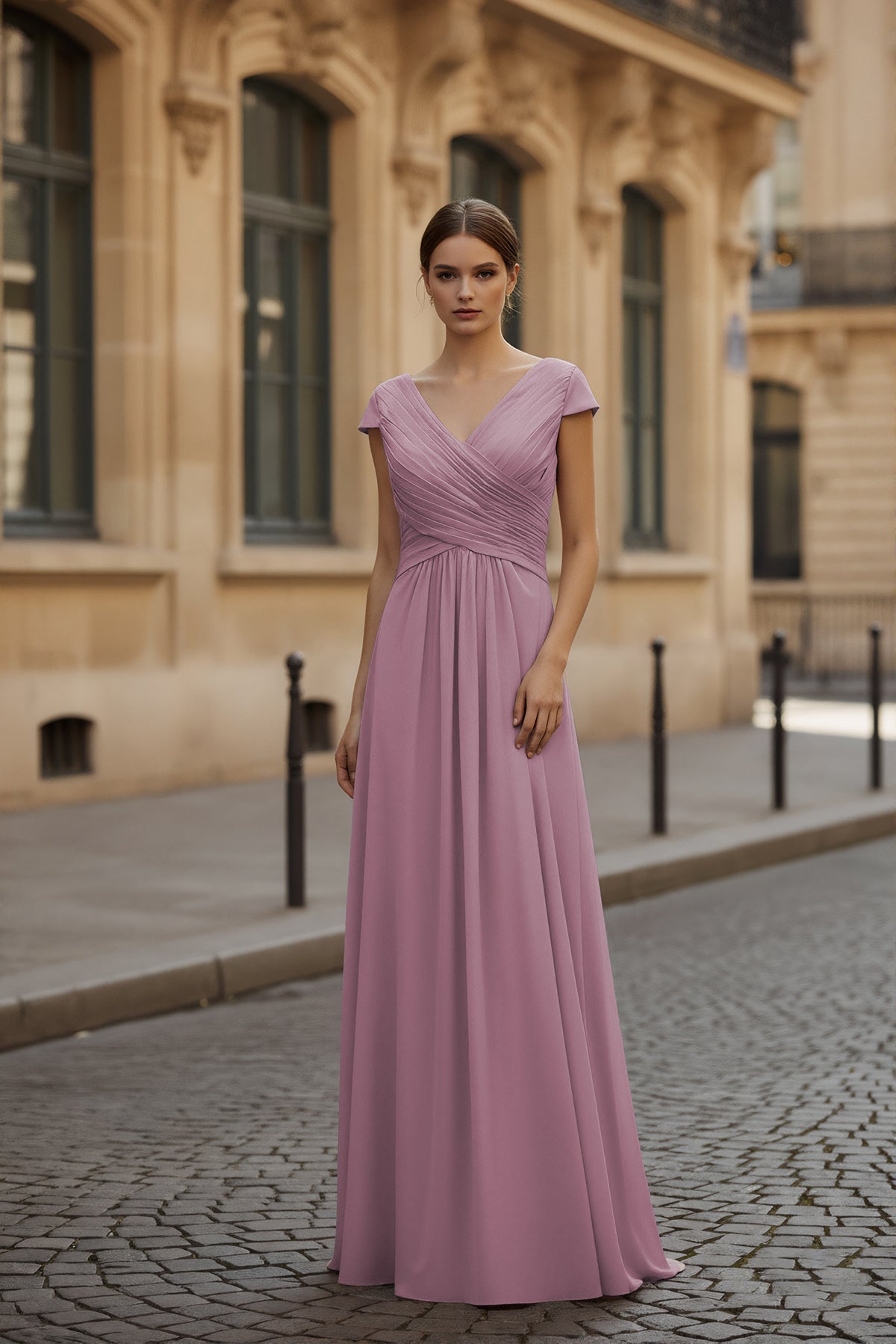 Cap Sleeve V Neck Chiffon A-Line Prom Dress with Ruched Bodice-TFB8029