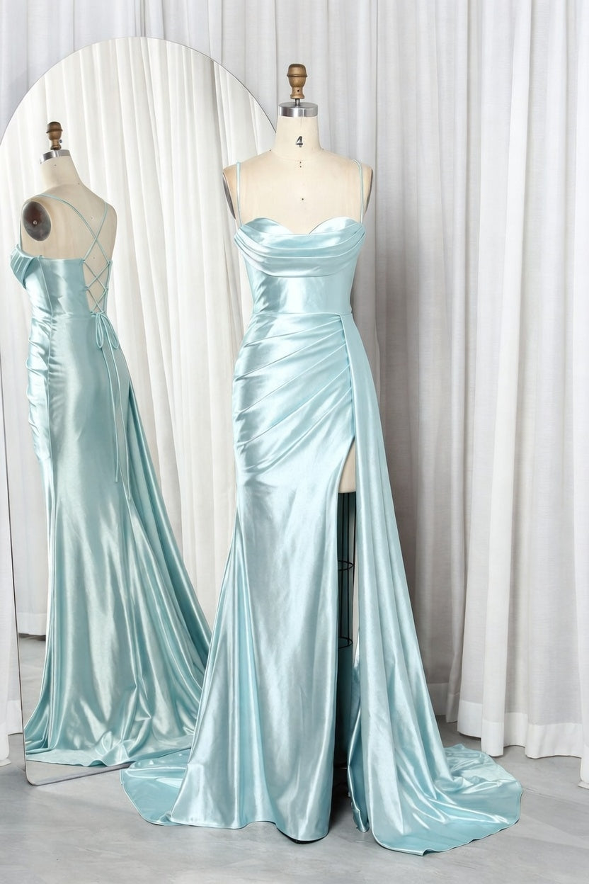 Draped Sweetheart Satin Prom Dress with Spaghetti Straps, Side Slit & Train – TFB 6013