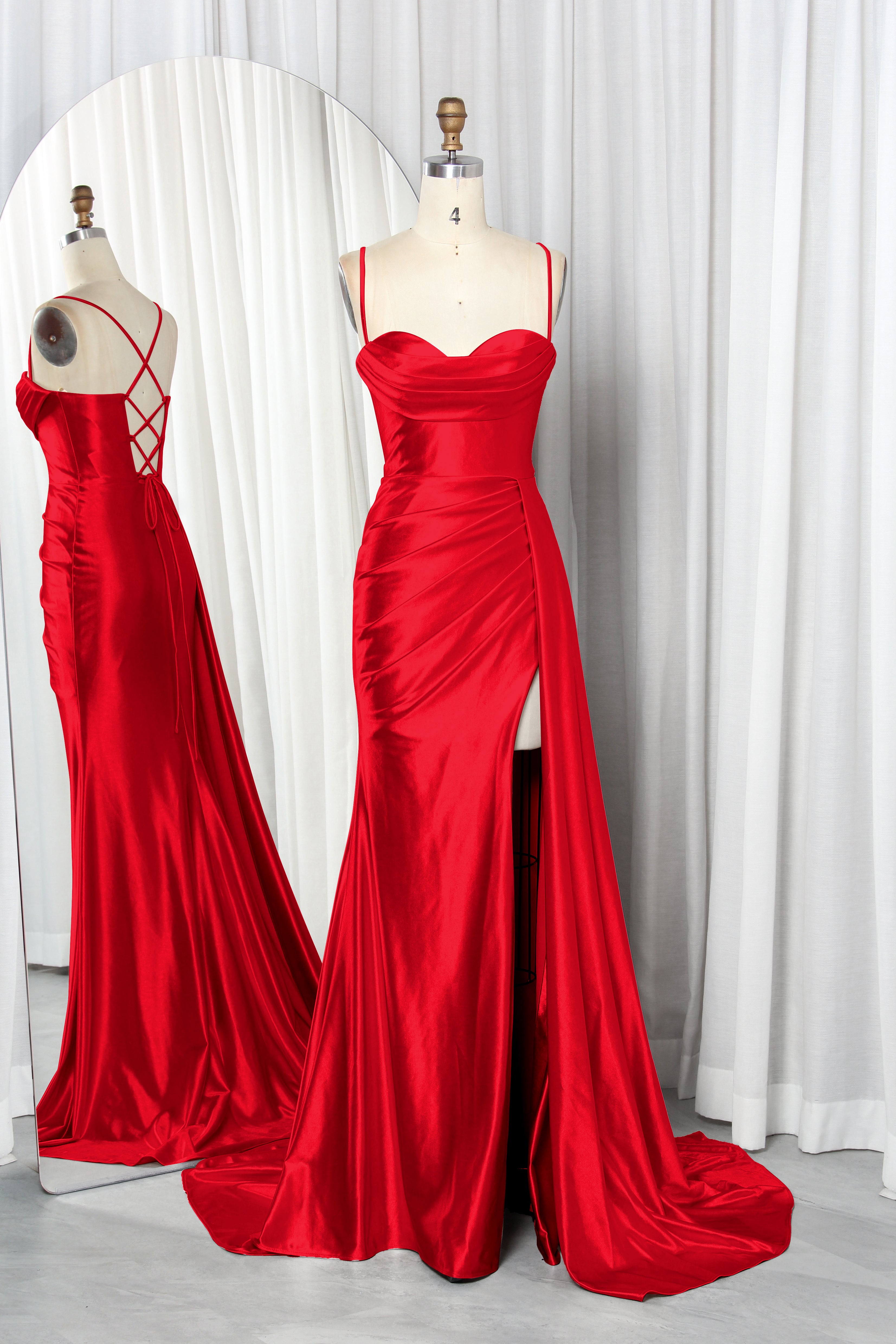 Draped Sweetheart Satin Prom Dress with Spaghetti Straps, Side Slit & Train – TFB6013