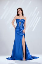Command attention in this elegant satin prom dress with spaghetti straps and keyhole cutout. The ruched sweetheart bodice highlights the figure, while the subtle cutout detail adds a hint of allure. Crafted from glossy satin, the skirt flows smoothly over the hips before cascading into a dramatic floor-length train that moves beautifully with every step.