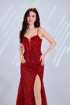 Elevate your evening look with this stunning mermaid dress, shimmering with all-over sequins for a radiant glow. The slender spaghetti straps and plunging neckline create a delicate yet bold silhouette. A lace-up back allows you to customize the fit perfectly, while the thigh-high side slit adds an unexpected hint of allure. Whether it’s prom night or a formal gala, this dress ensures you’ll captivate every room you enter.