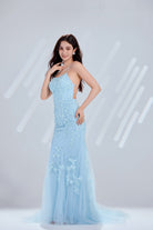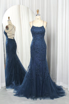 Turn heads in this mermaid tulle prom dress featuring delicate spaghetti straps and intricate lace embroidery. The fitted bodice enhances your silhouette, while layers of flowing tulle create a dramatic mermaid skirt and train that glides elegantly with every step. Romantic lace details adorn the gown, adding a timeless touch of sophistication and charm.