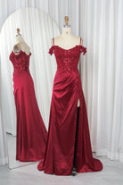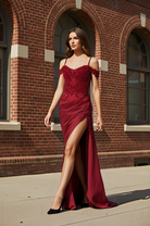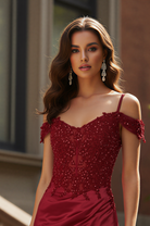 Satin Prom Dress with Spaghetti Straps, Lace Appliques & High Side Slit-TFB8006