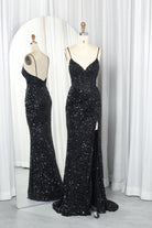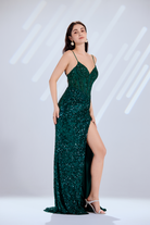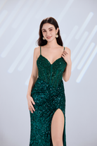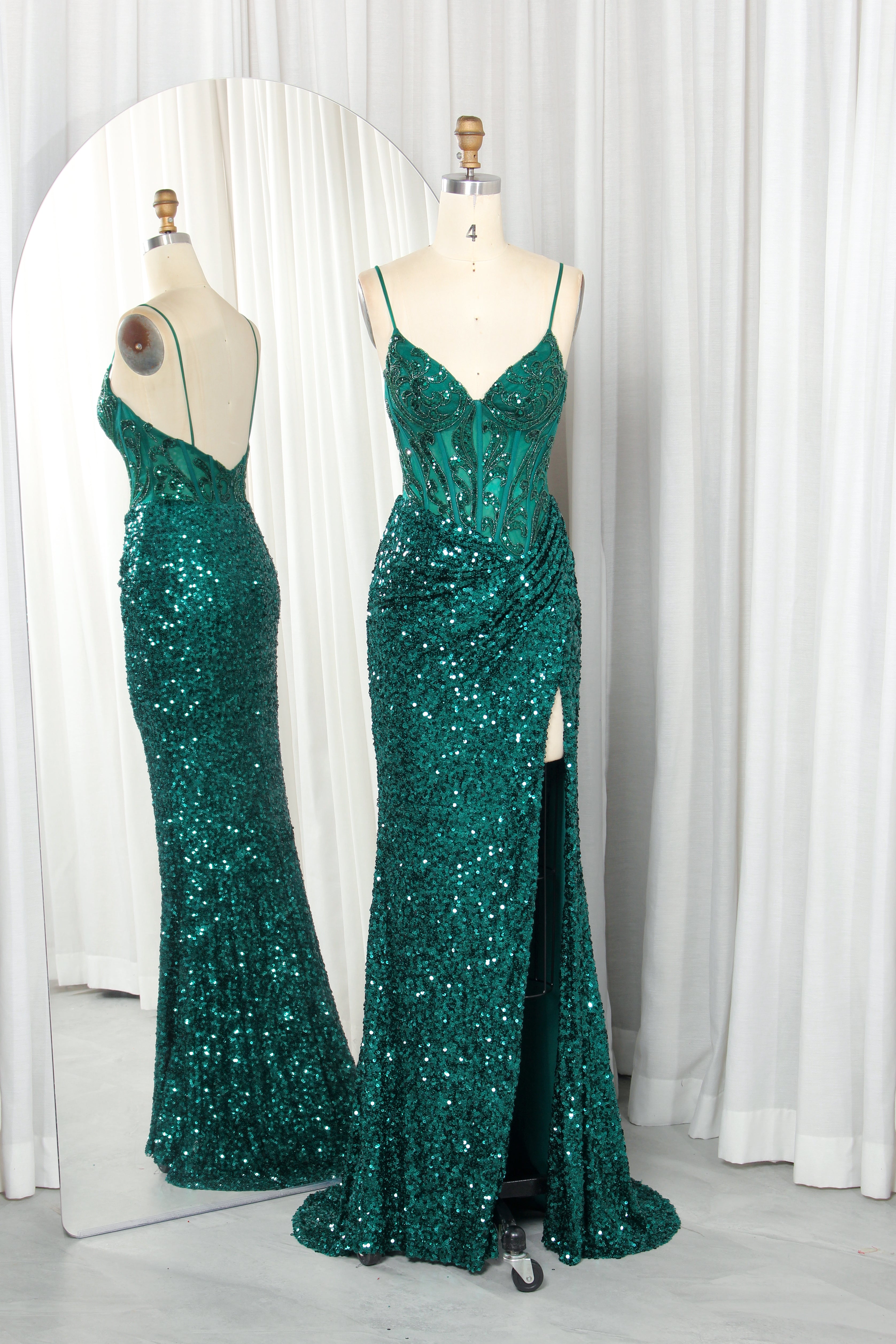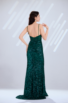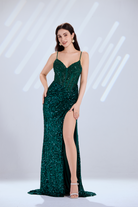 Sequin Satin Prom Dress with Beaded Bodice, Spaghetti Straps & Slit – TFB6010