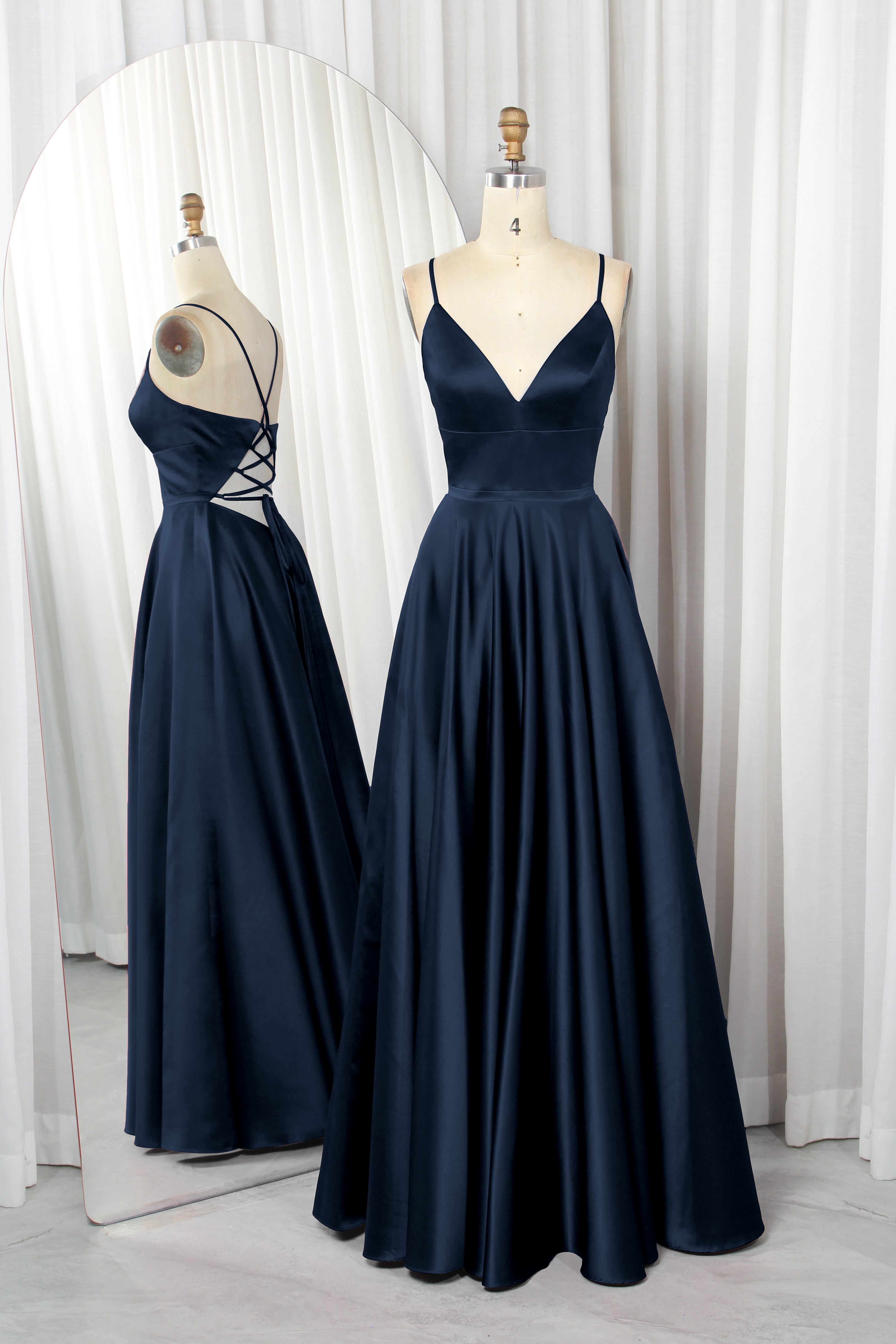 Make an unforgettable entrance in this satin ball gown, crafted for timeless elegance. The gown features slender spaghetti straps framing a dramatic deep V-neckline, while the lustrous satin fabric catches the light with every movement. A lace-up back not only adds a hint of allure but also allows for a personalized, secure fit. The sweeping floor-length skirt flows effortlessly, making this dress a stunning choice for proms, galas, formal dinners, or any occasion where you want to stand out in style.