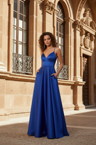 Spaghetti Strap Deep V-Neck Satin Ball Gown with Adjustable Lace-Up Back-TFB8004