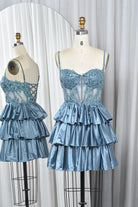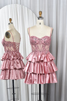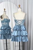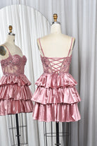Spaghetti Strap Lace Bodice and Tiered Satin Homecoming Dress-TFB5025