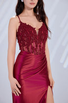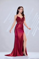 Step into elegance with this satin mermaid prom dress, designed to make an unforgettable impression. Slender spaghetti straps frame the neckline, while the bodice is decorated with intricate lace appliques that add a touch of romance and luxury. The sleek satin skirt skims the figure before flowing to a graceful floor-length hem. A crisscross back offers both alluring style and an adjustable fit, while the side slit adds movement and a hint of drama. Perfect for proms, evening galas, or any formal occasion where you want to stand out in style.