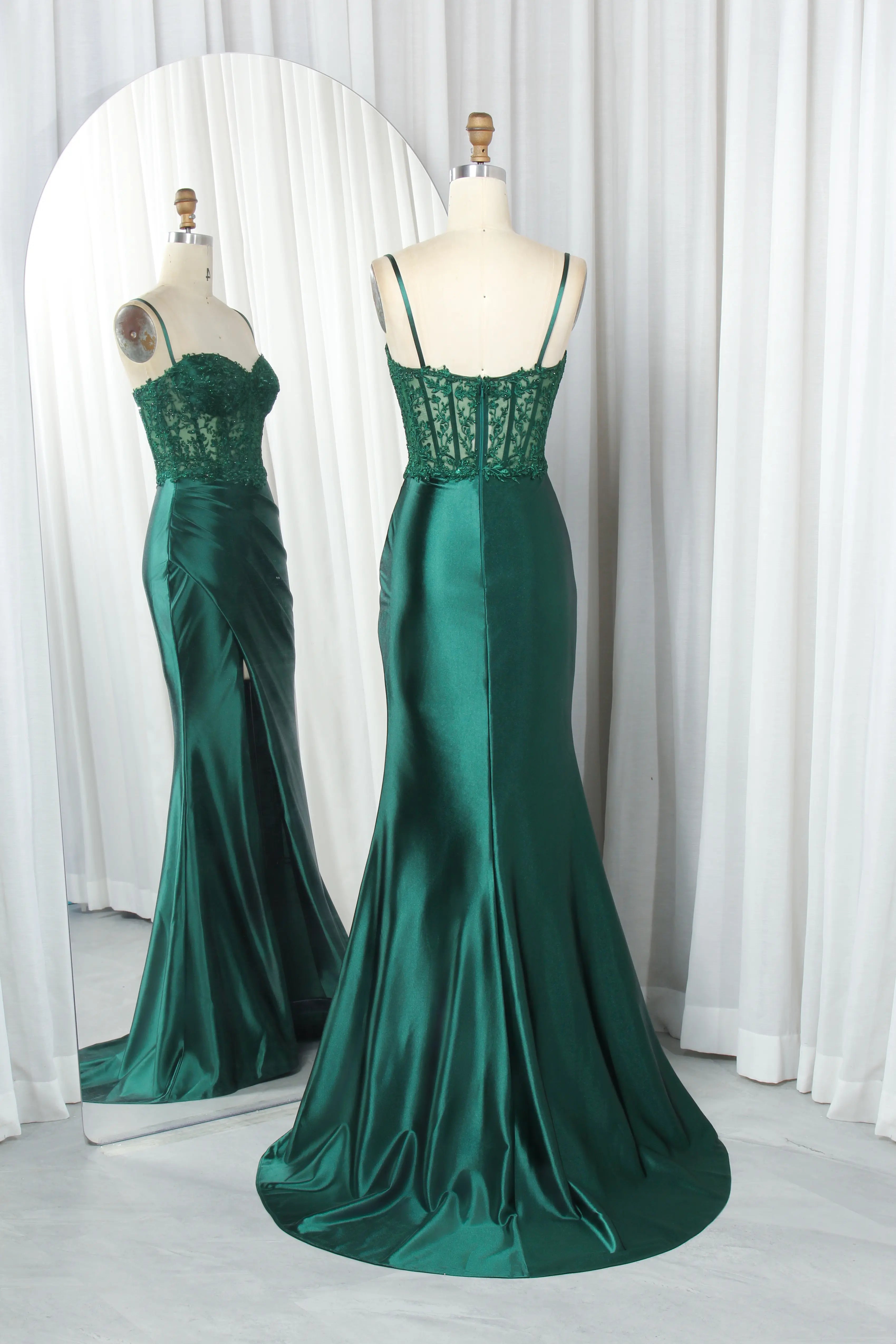 Sheer Lace Corset Satin Mermaid Prom Dress with High Slit - TFB 8011 | blissfulprom