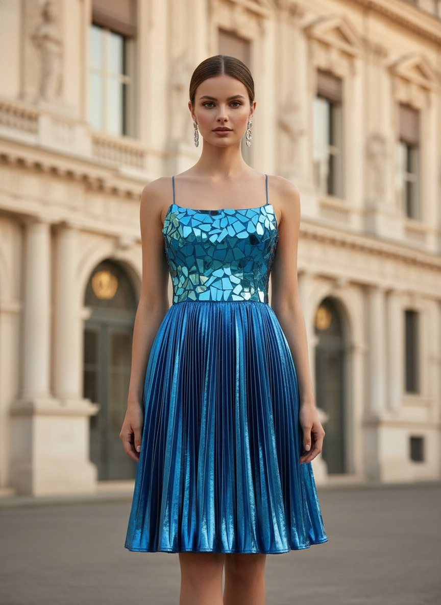 This homecoming dress features spaghetti straps and sparkling sequin embellishments on the fitted bodice. A pleated skirt adds volume and movement, creating a dazzling, eye-catching look. Ideal for homecoming dances, parties, or school events, this dress ensures you shine throughout the evening.