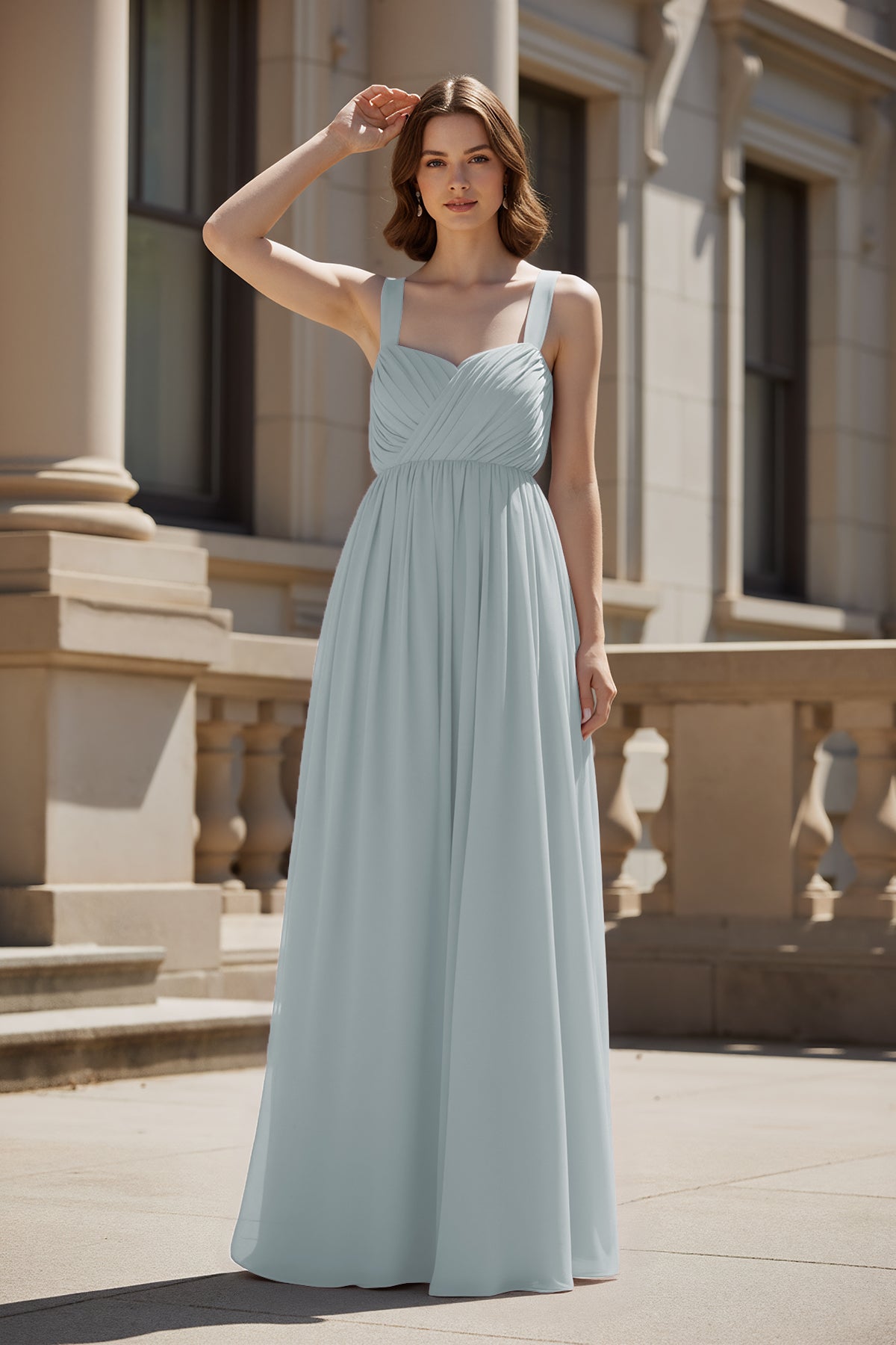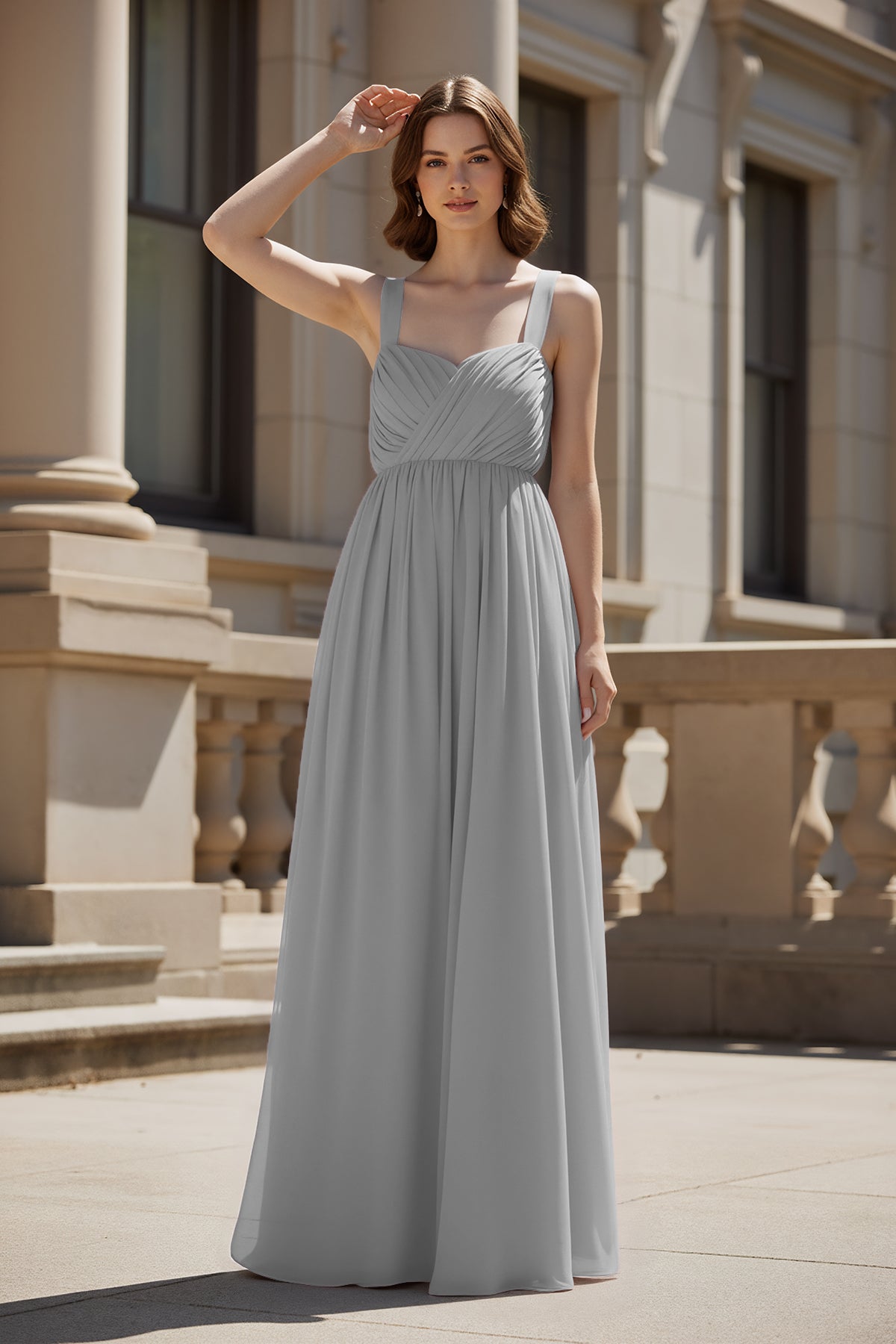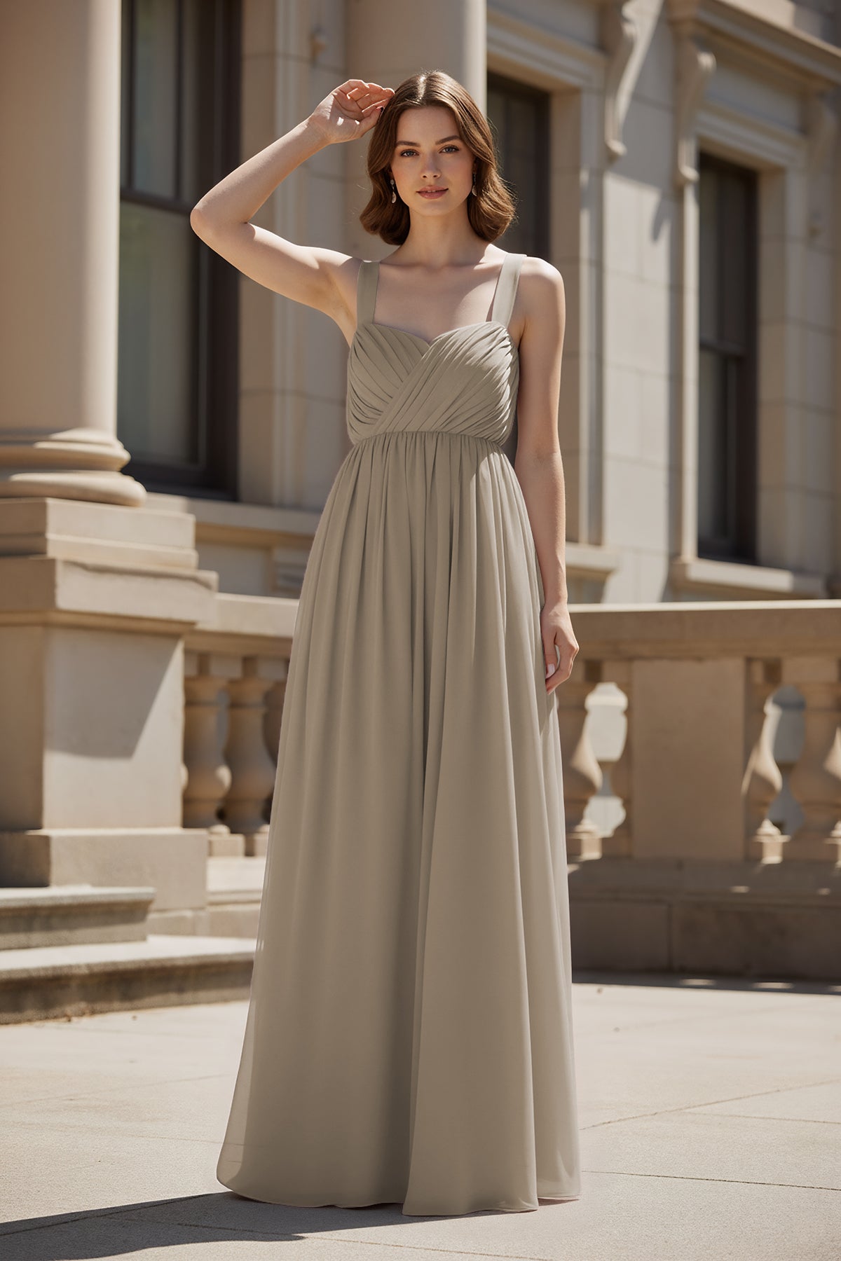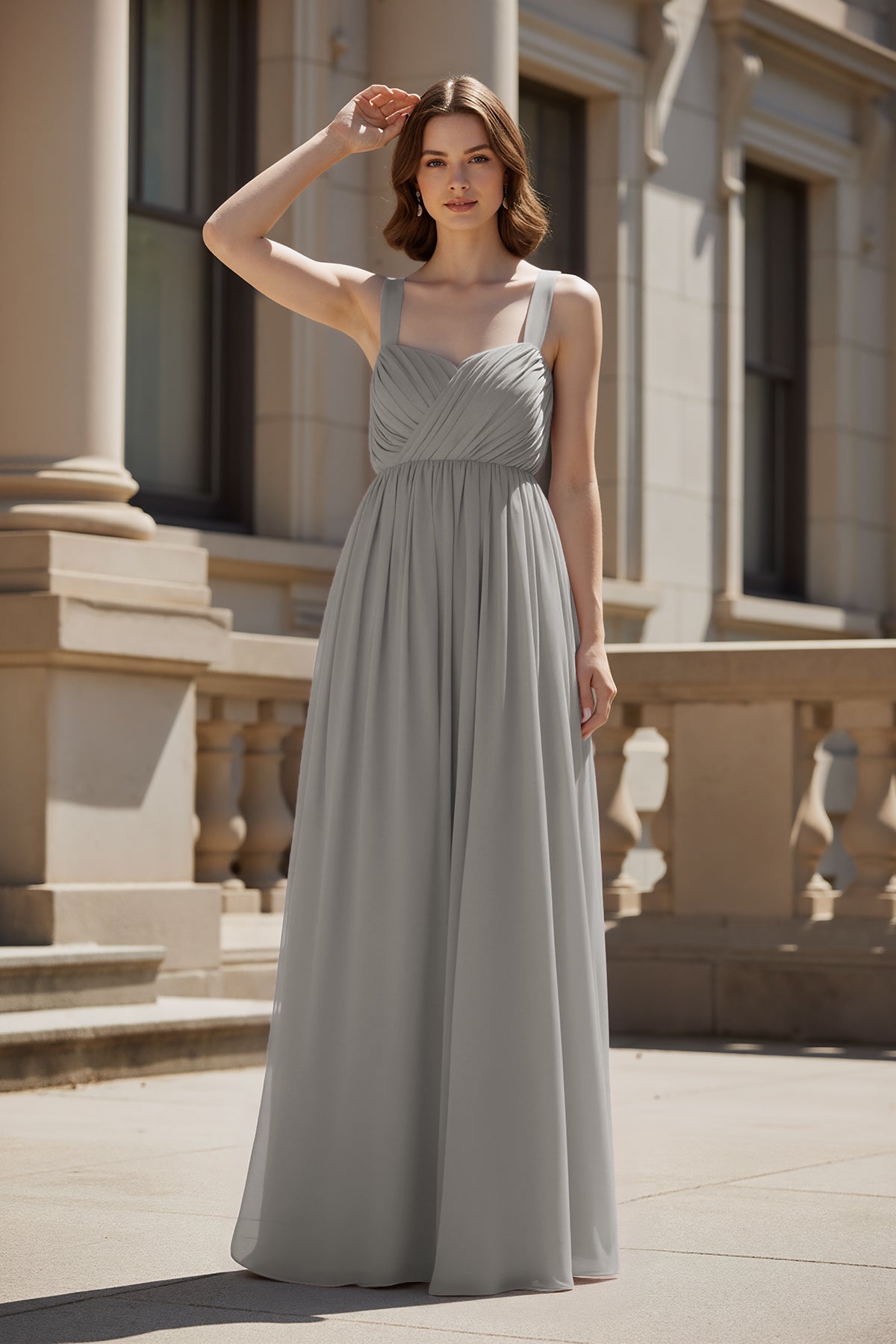 Designed with a chic square neckline, this chiffon gown offers a refined yet modern appeal. Gentle ruching along the bodice shapes the figure beautifully, while the airy full-length skirt moves with graceful fluidity. The adjustable tie-back not only adds a stylish detail but also ensures a comfortable, personalized fit. A sophisticated choice for prom nights, black-tie galas, or any celebration where elegance is key.