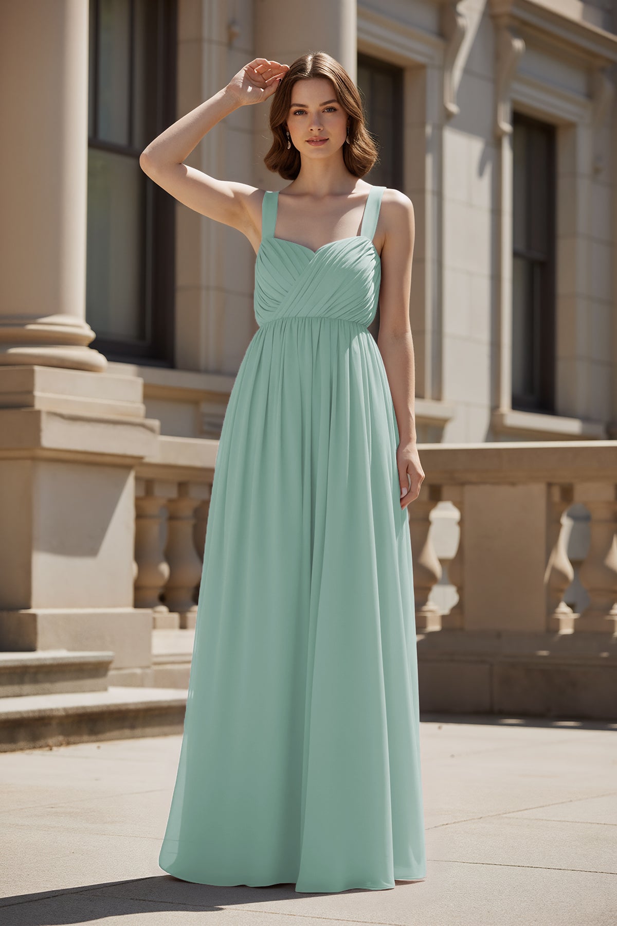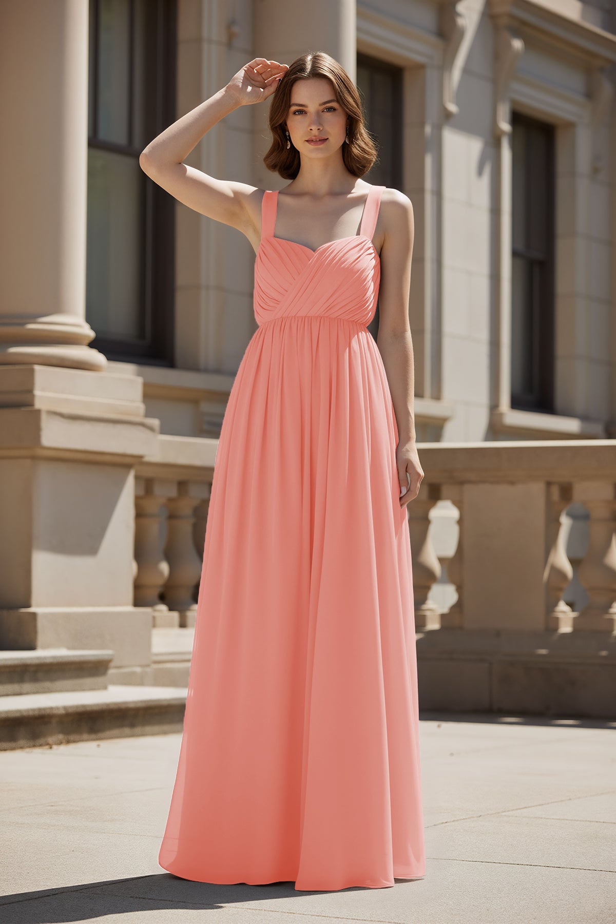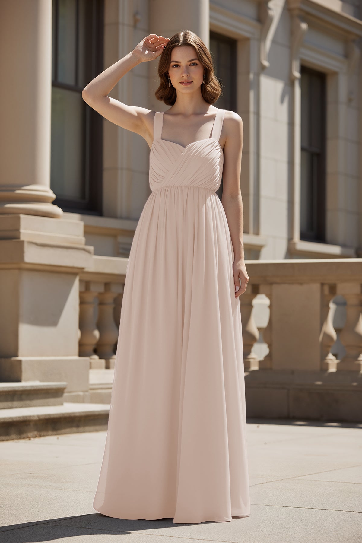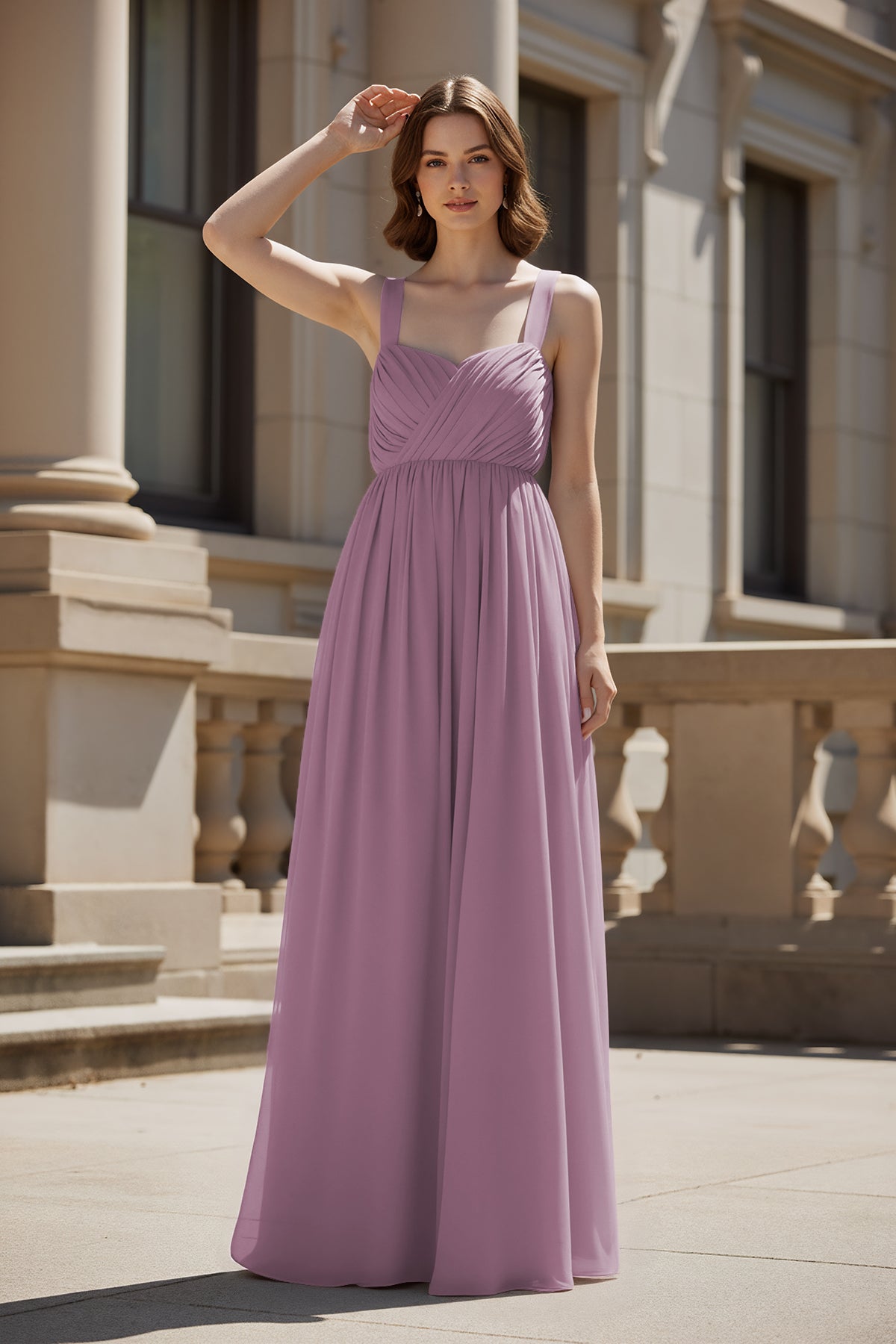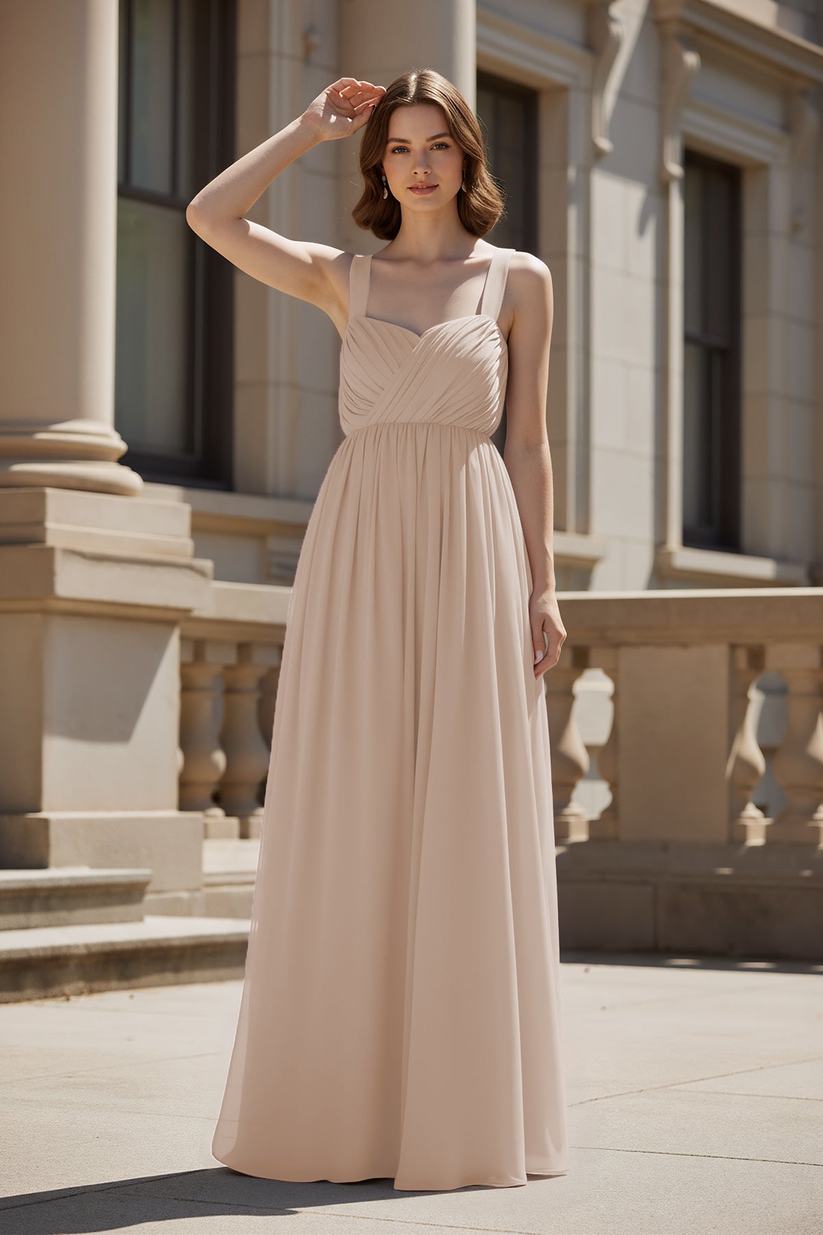 Designed with a chic square neckline, this chiffon gown offers a refined yet modern appeal. Gentle ruching along the bodice shapes the figure beautifully, while the airy full-length skirt moves with graceful fluidity. The adjustable tie-back not only adds a stylish detail but also ensures a comfortable, personalized fit. A sophisticated choice for prom nights, black-tie galas, or any celebration where elegance is key.