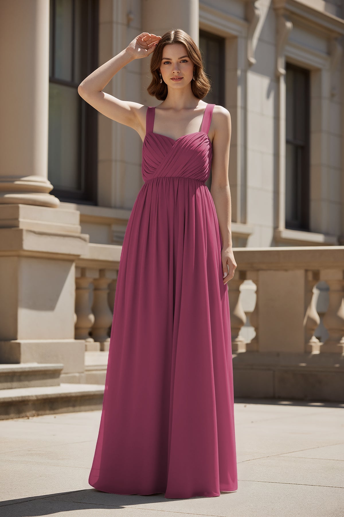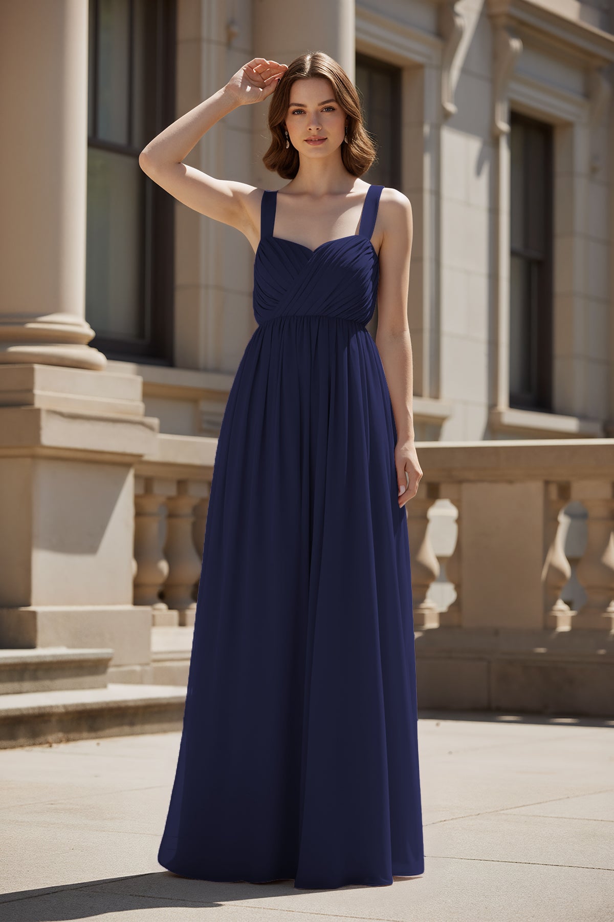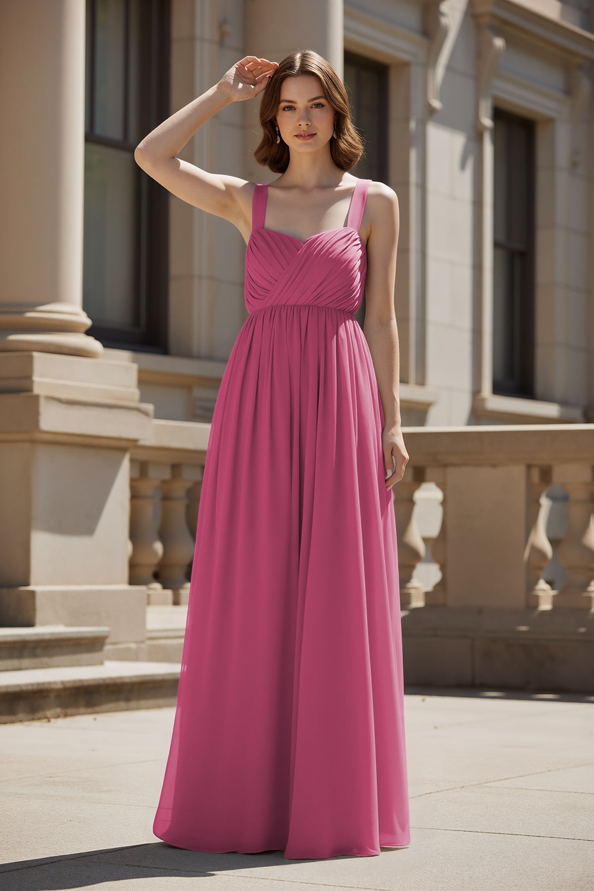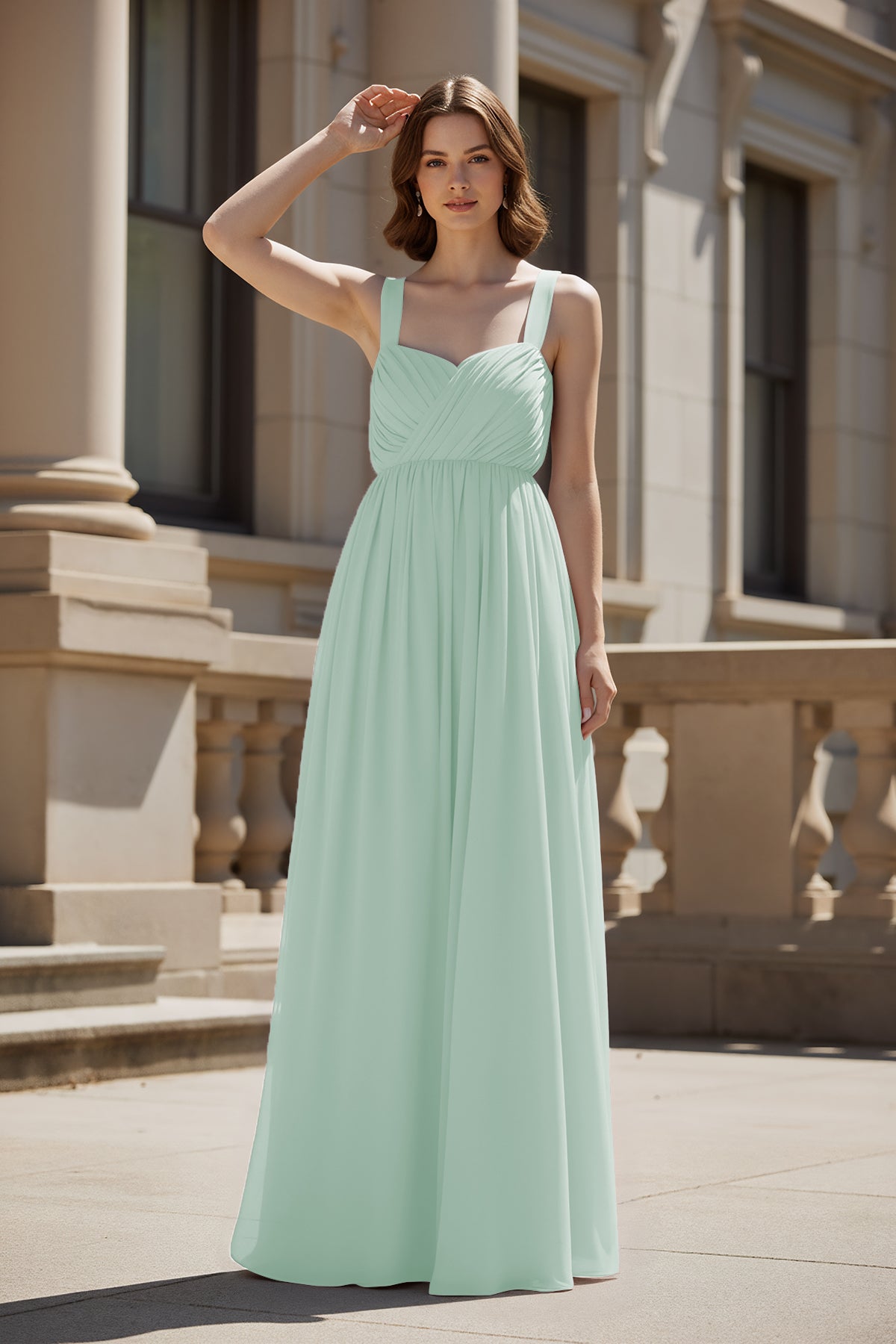 Designed with a chic square neckline, this chiffon gown offers a refined yet modern appeal. Gentle ruching along the bodice shapes the figure beautifully, while the airy full-length skirt moves with graceful fluidity. The adjustable tie-back not only adds a stylish detail but also ensures a comfortable, personalized fit. A sophisticated choice for prom nights, black-tie galas, or any celebration where elegance is key.