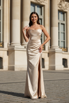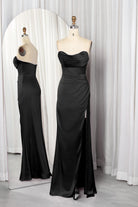 Strapless Satin Prom Dress with Draped Bodice & Side Slit – TFB6020