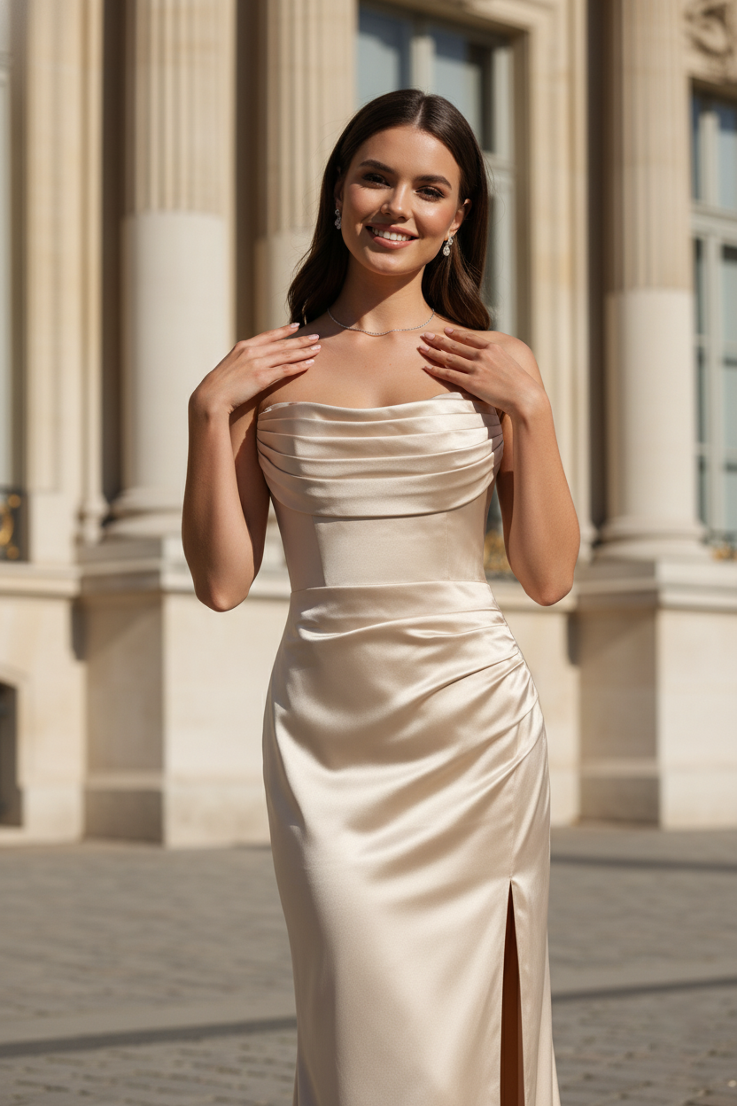 Step into elegance with this strapless satin prom dress featuring a draped bodice and side slit. The glossy satin fabric catches the light beautifully, while subtle ruching shapes the figure for a flattering silhouette. The flowing skirt with a side slit adds movement and sophistication, making this gown perfect for prom nights, gala events, or formal weddings.