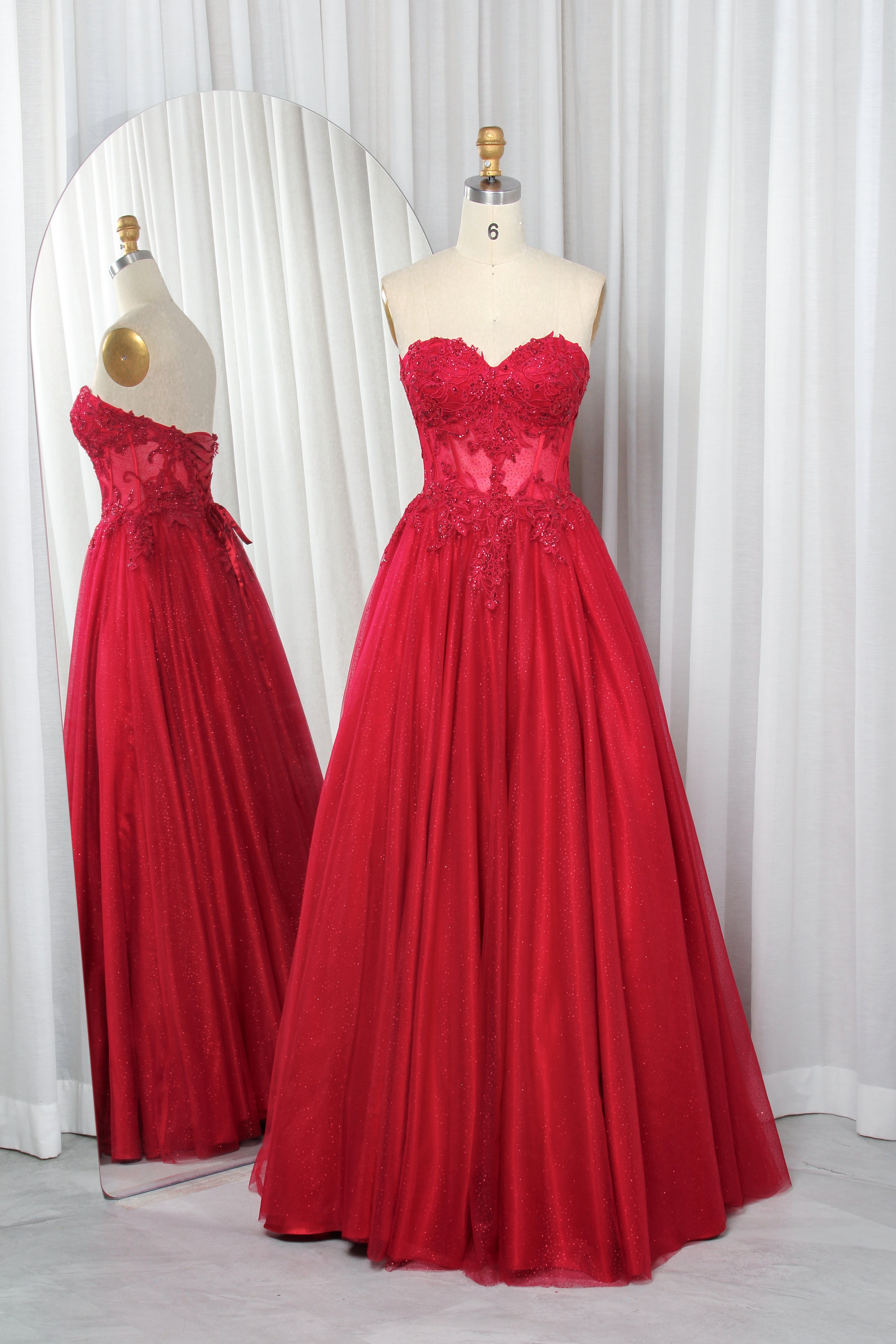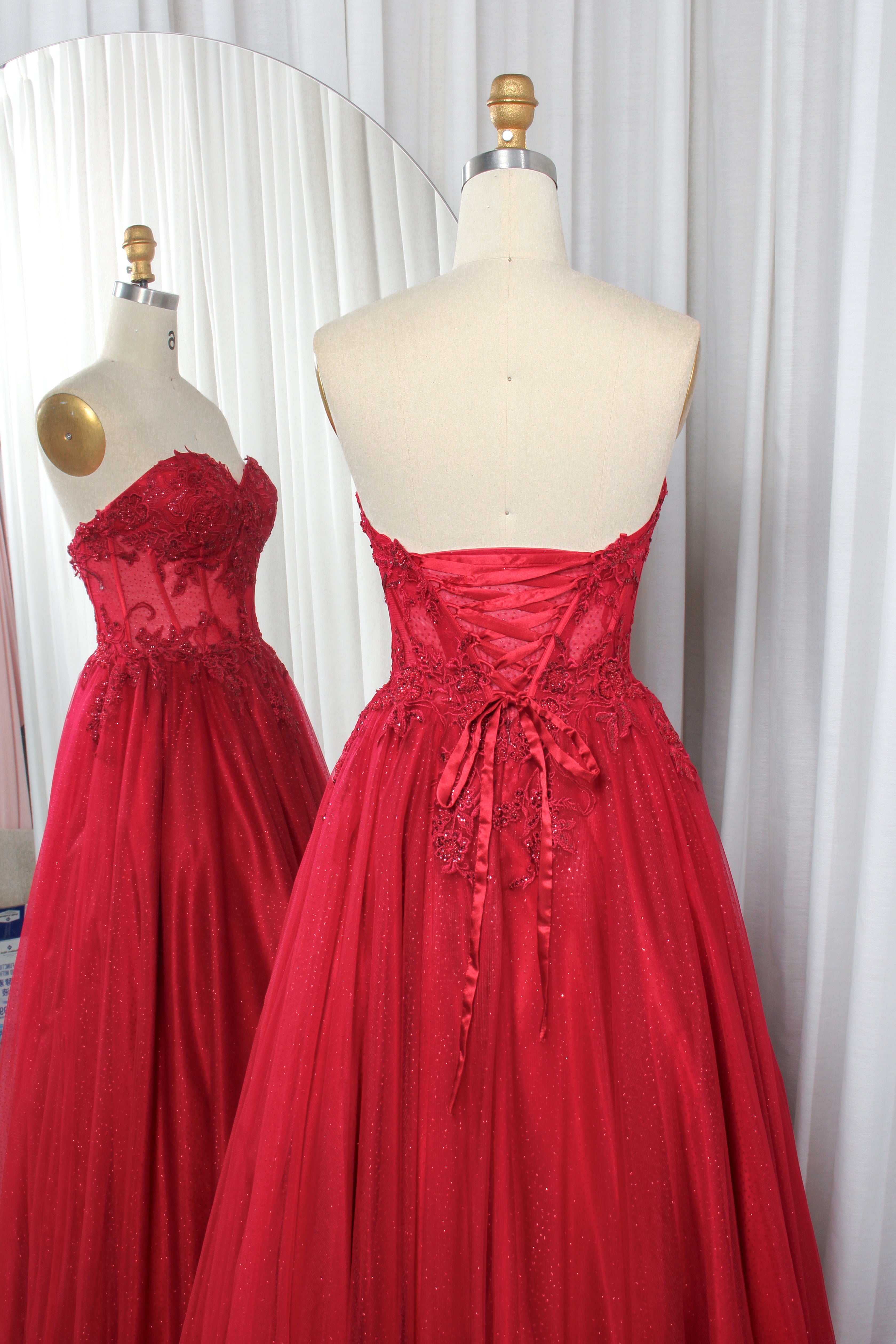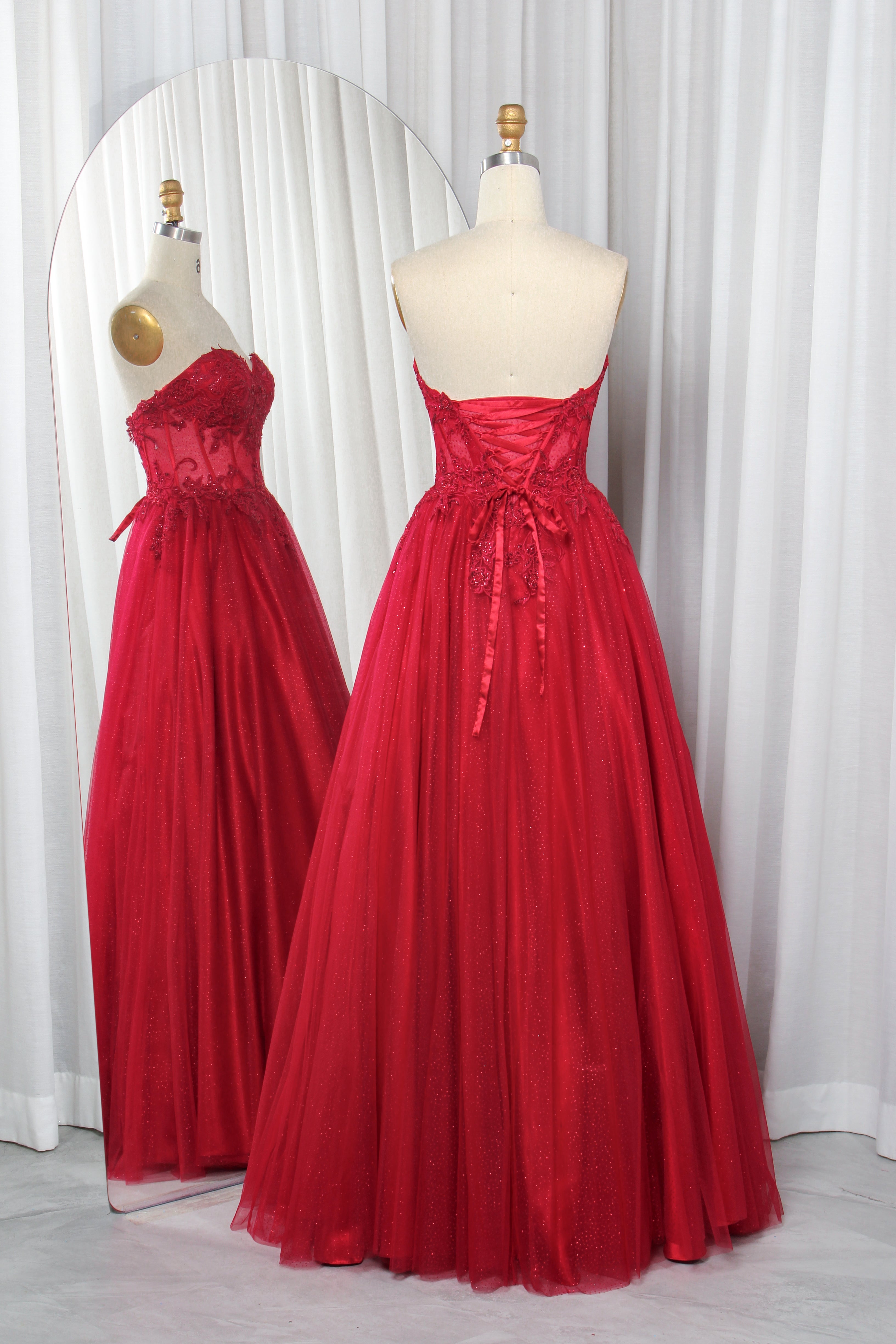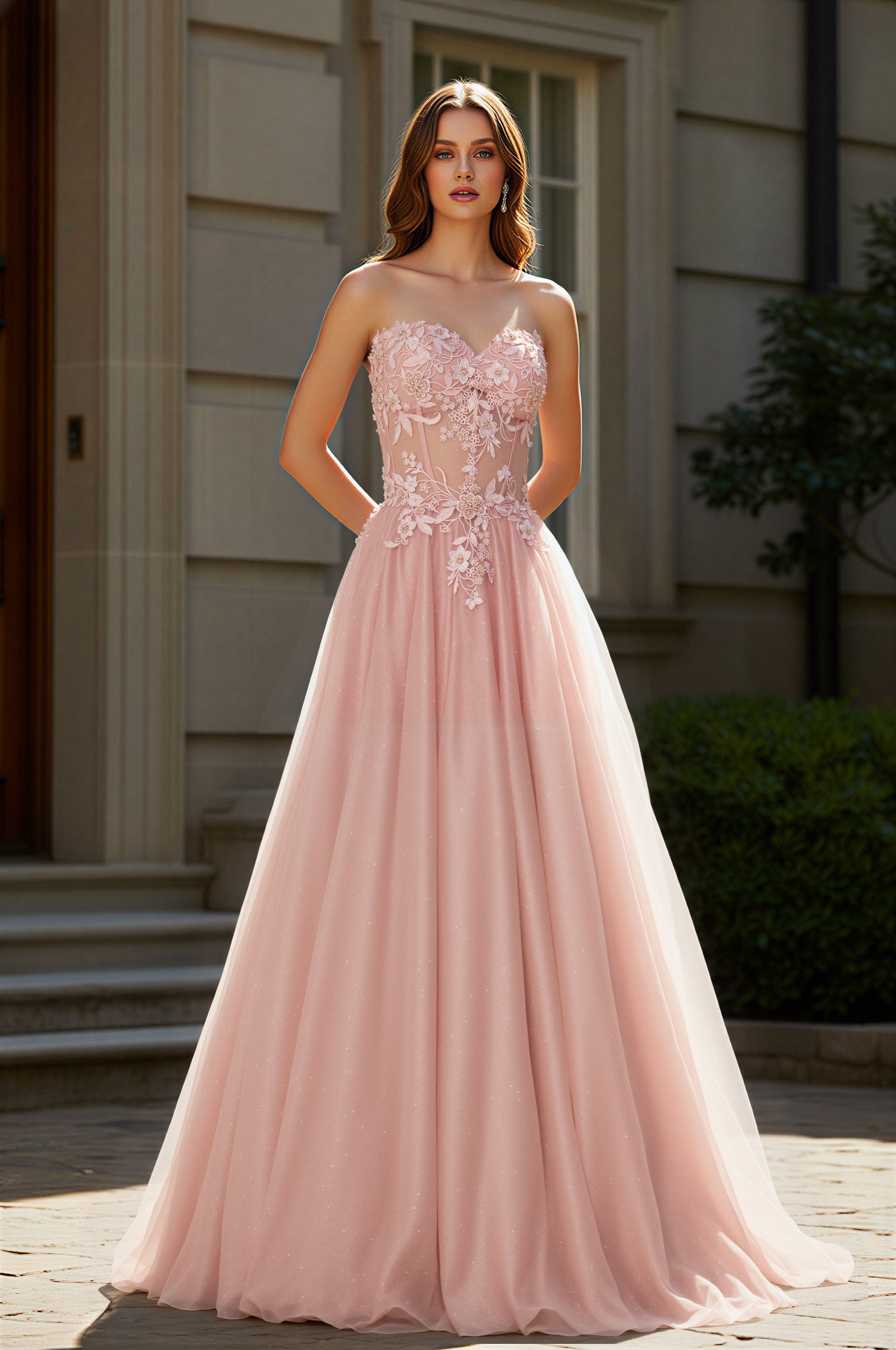Exude timeless elegance in this strapless tulle ball gown, designed to capture attention from the first glance. The sweetheart neckline flatters the décolletage, while the bodice is adorned with intricate lace appliques for a refined, romantic touch. Layers of airy tulle create a full, floor-length skirt that moves beautifully, adding a dreamy dimension to your look. The corset back not only enhances the silhouette but also allows for a custom, secure fit. Perfect for proms, galas, pageants, or any formal event where you want to make a lasting impression.