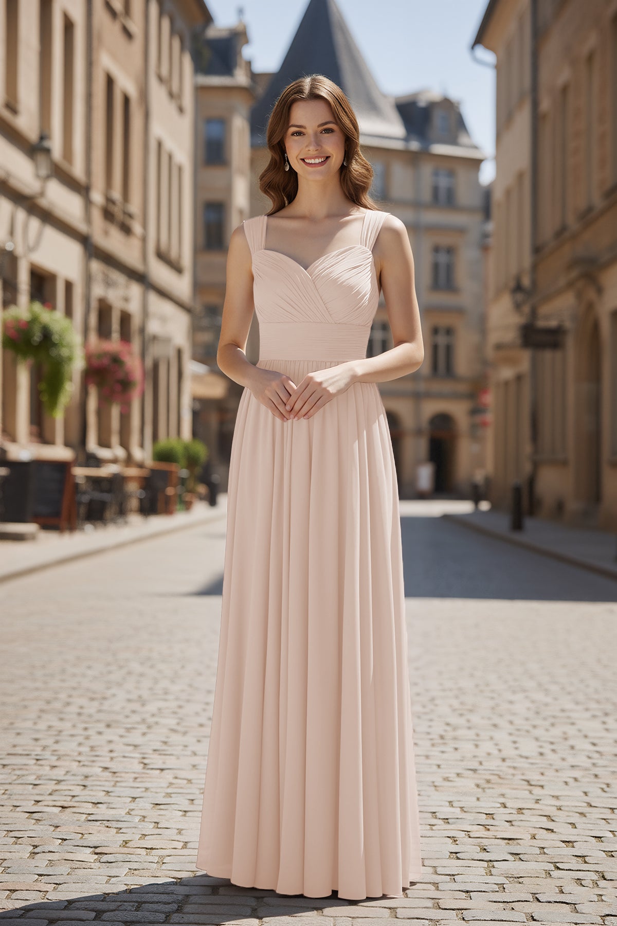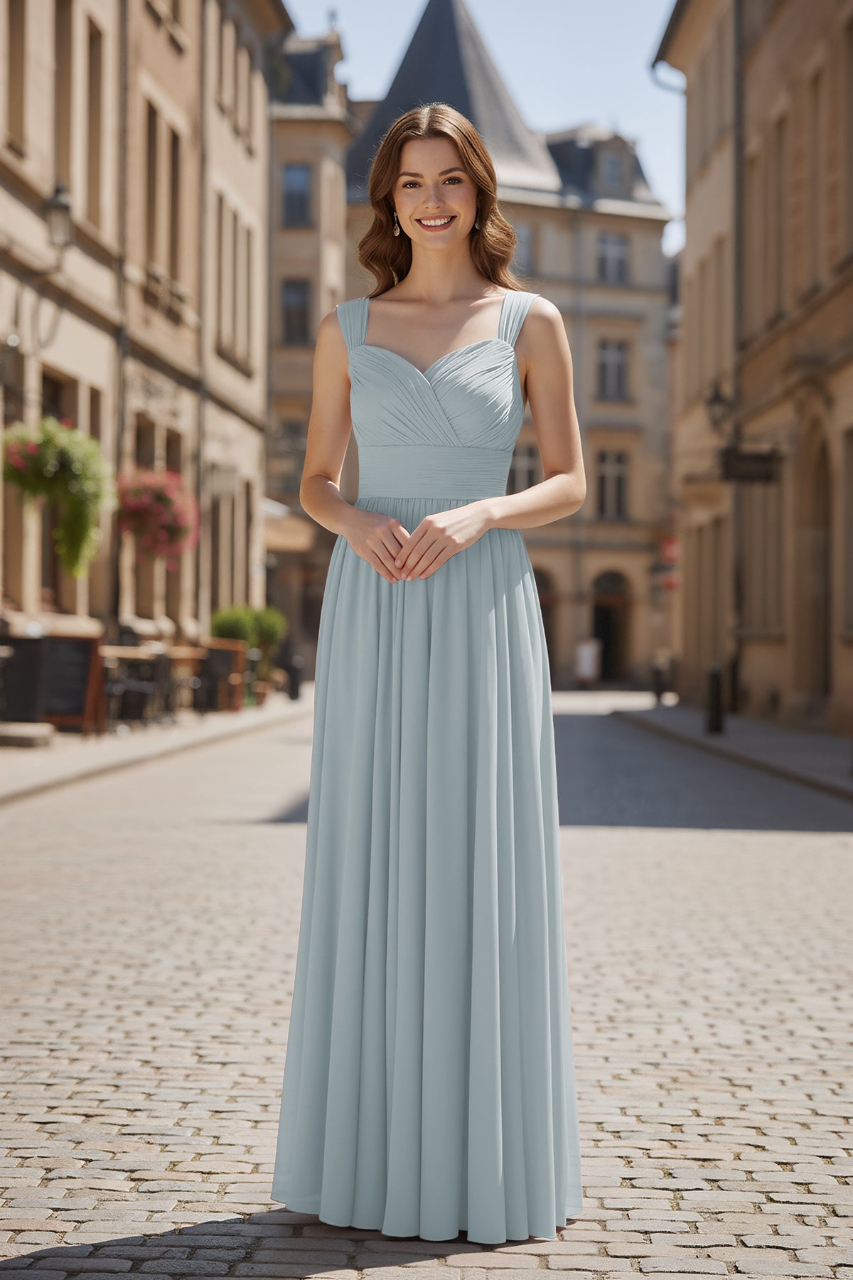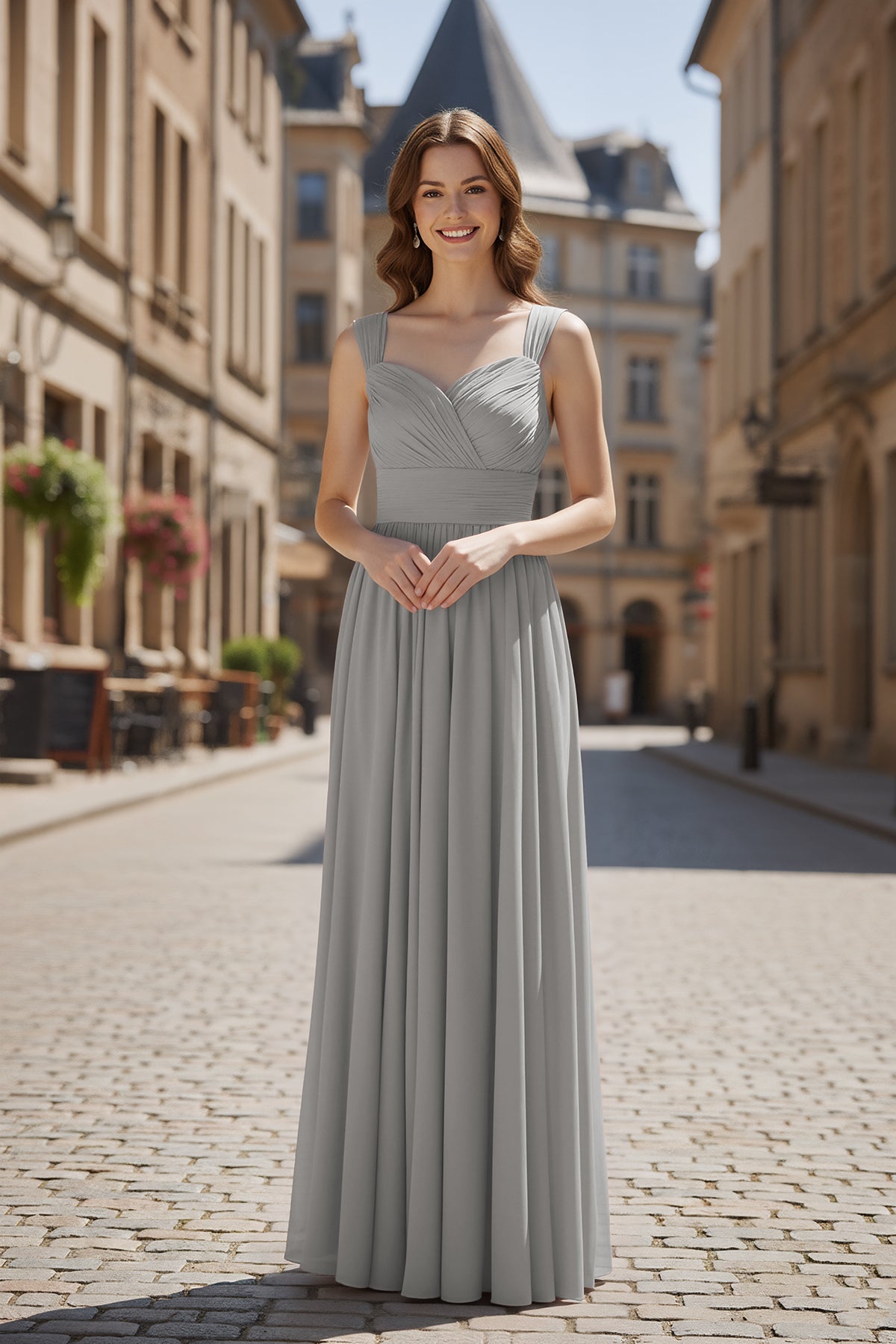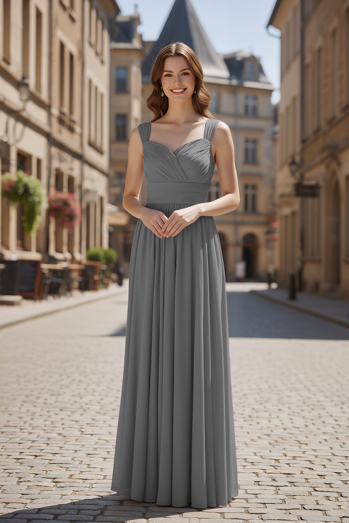 Crafted for elegance, this chiffon evening gown features a soft sweetheart neckline and a finely ruched bodice that flatters the figure. The full-length skirt flows beautifully with every step, while a subtle back slit lends a hint of allure. Perfect for proms, formal dinners, or grand celebrations, this design blends sophistication with graceful movement.