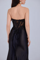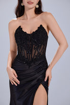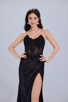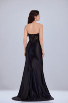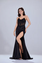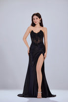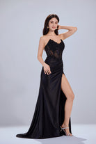 This prom dress features a sweetheart neckline with lace detailing on the bodice and a draped satin skirt. A side slit adds subtle allure and movement. Perfect for prom nights, gala events, or formal school celebrations, this dress combines classic elegance with a flattering, sophisticated silhouette.